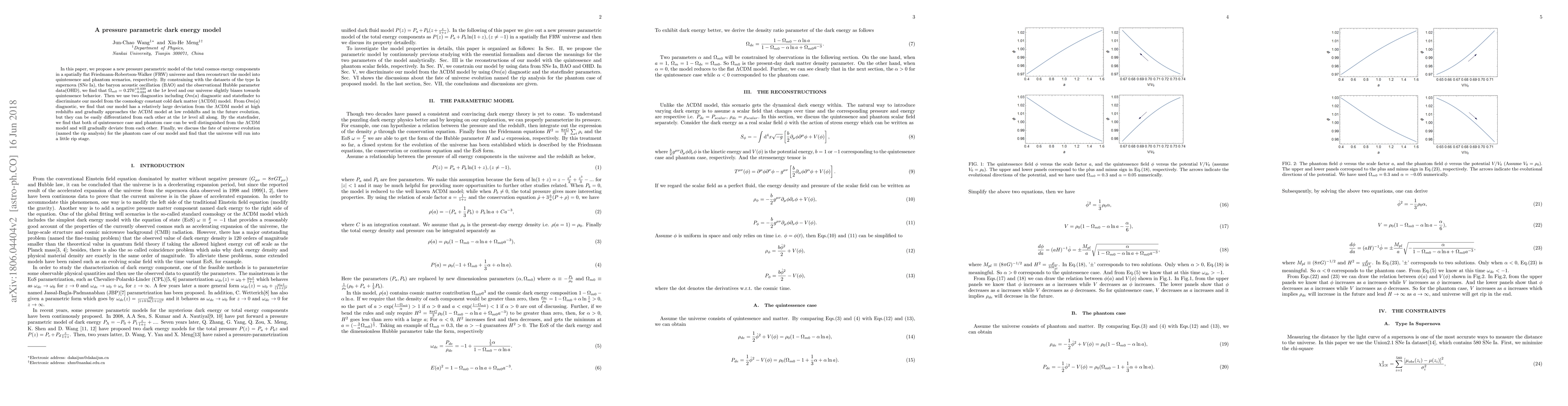 In this paper, we propose a new pressure parametric model of the total cosmos energy components in a spatially flat Friedmann-Robertson-Walker (FRW) universe and then reconstruct the model into quintessence and phantom scenarios, respectively. By constraining with the datasets of the type Ia supernova (SNe Ia), the baryon acoustic oscillation (BAO) and the observational Hubble parameter data(OHD), we find that $\Omega_{m0}=0.270^{+0.039}_{-0.034}$ at the 1$\sigma$ level and our universe slightly biases towards quintessence behavior. Then we use two diagnostics including $Om(a)$ diagnostic and statefinder to discriminate our model from the cosmology constant cold dark matter ($\Lambda$CDM) model. From $Om(a)$ diagnostic, we find that our model has a relatively large deviation from the $\Lambda$CDM model at high redshifts and gradually approaches the $\Lambda$CDM model at low redshifts and in the future evolution, but they can be easily differentiated from each other at the 1$\sigma$ level all along. By the statefinder, we find that both of quintessence case and phantom case can be well distinguished from the $\Lambda$CDM model and will gradually deviate from each other. Finally, we discuss the fate of universe evolution (named the rip analysis) for the phantom case of our model and find that the universe will run into a little rip stage.
