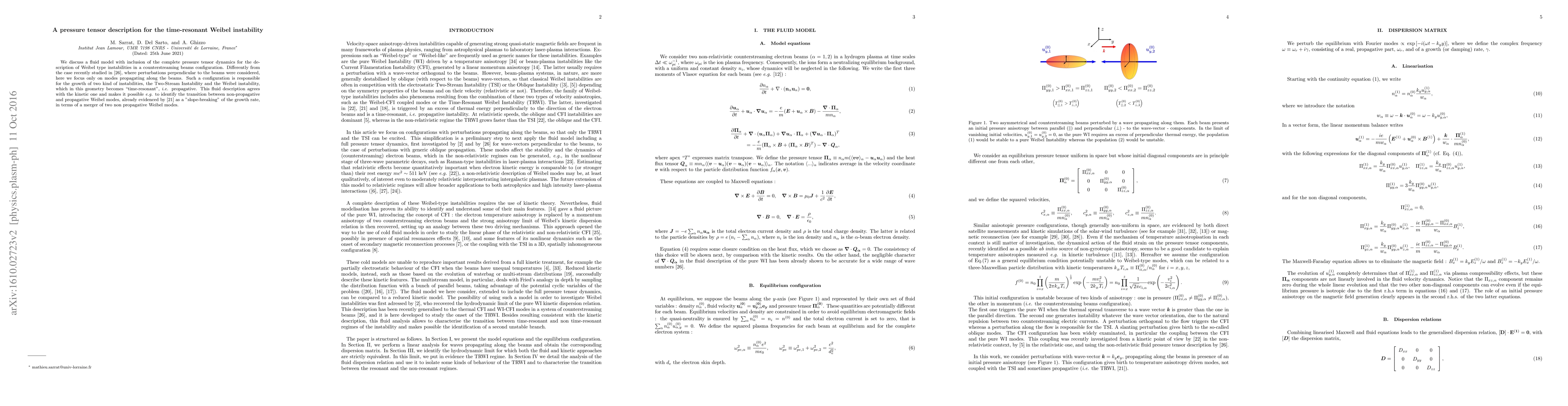 This paper presents a fluid model incorporating the complete pressure tensor dynamics to describe Weibel instabilities in counterstreaming beams, focusing on modes propagating along the beams. It identifies the transition from non-propagative to propagative Weibel modes, termed "time-resonant," and aligns with kinetic descriptions.