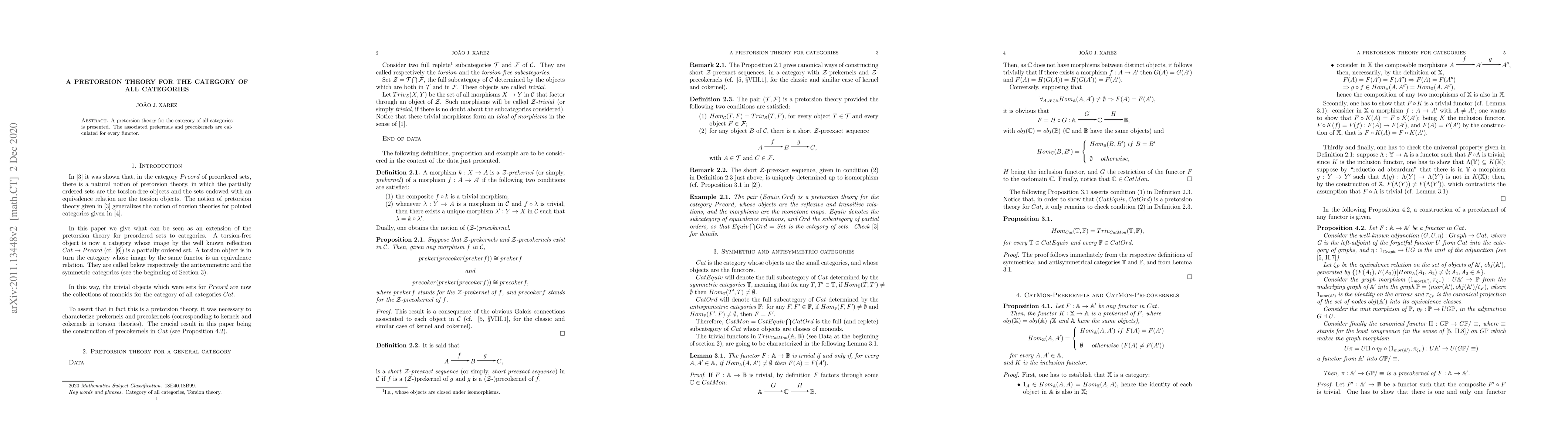 This paper introduces a pretorsion theory for the category of all categories, detailing how to calculate associated prekernels and precokernels for any functor within this framework.