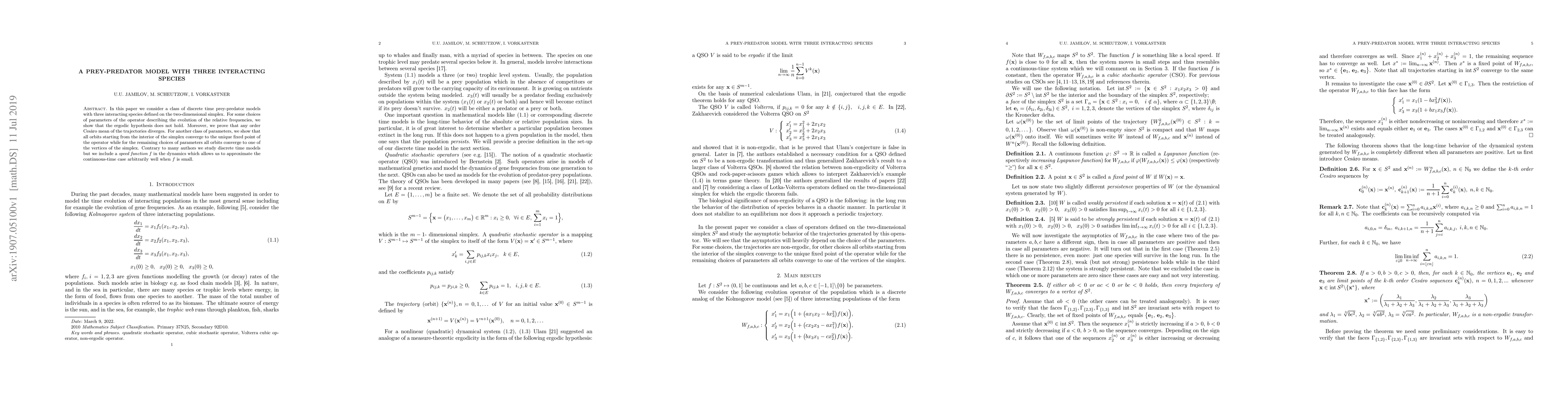 In this paper we consider a class of discrete time prey-predator models with three interacting species defined on the two-dimensional simplex. For some choices of parameters of the operator describing the evolution of the relative frequencies, we show that the ergodic hypothesis does not hold. Moreover, we prove that any order Ces\`aro mean of the trajectories diverges. For another class of parameters, we show that all orbits starting from the interior of the simplex converge to the unique fixed point of the operator while for the remaining choices of parameters all orbits converge to one of the vertices of the simplex. Contrary to many authors we study discrete time models but we include a speed function $f$ in the dynamics which allows us to approximate the continuous-time case arbitrarily well when $f$ is small.