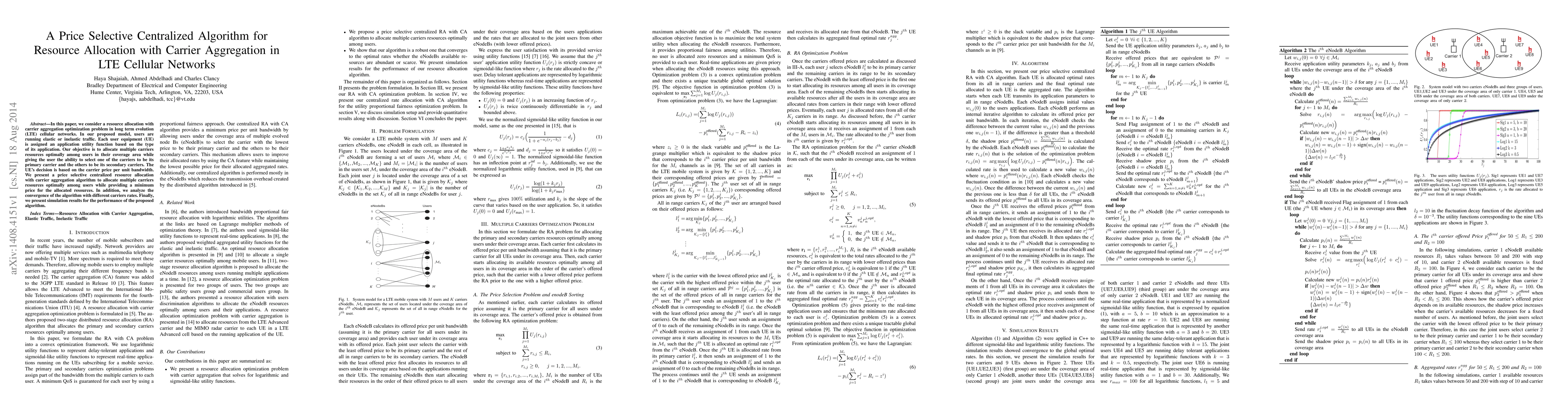 This paper proposes a centralized algorithm for optimizing resource allocation in LTE networks with carrier aggregation, enabling users to select carriers based on price. The algorithm aims to allocate multiple carriers efficiently, considering both elastic and inelastic traffic types, and analyzes its convergence with varying carrier rates, followed by simulation results demonstrating performance.