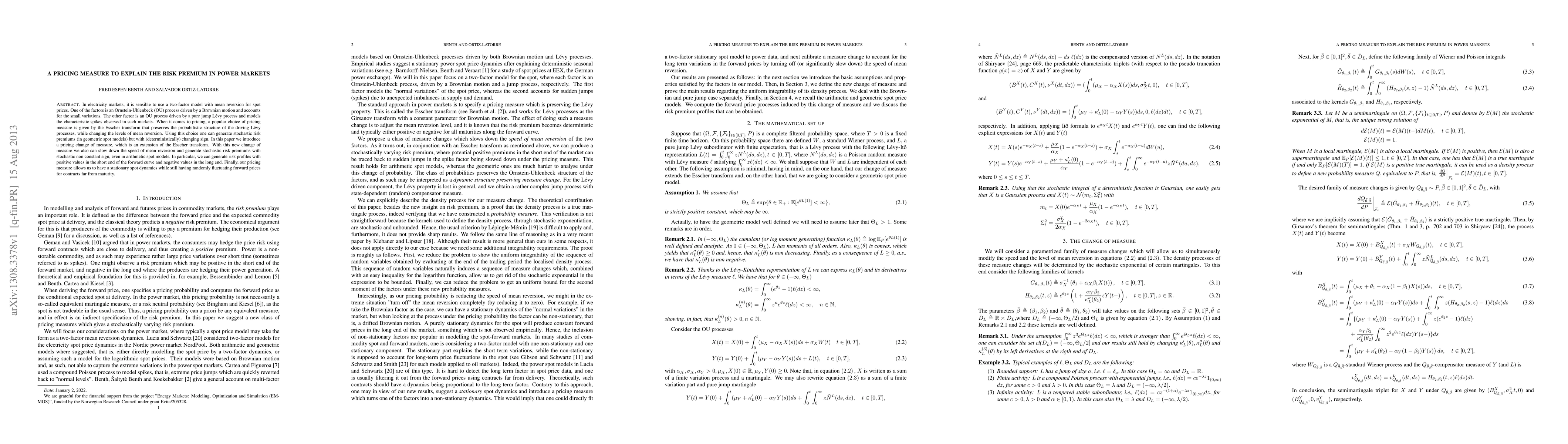 In electricity markets, it is sensible to use a two-factor model with mean reversion for spot prices. One of the factors is an Ornstein-Uhlenbeck (OU) process driven by a Brownian motion and accounts for the small variations. The other factor is an OU process driven by a pure jump L\'evy process and models the characteristic spikes observed in such markets. When it comes to pricing, a popular choice of pricing measure is given by the Esscher transform that preserves the probabilistic structure of the driving L\'evy processes, while changing the levels of mean reversion. Using this choice one can generate stochastic risk premiums (in geometric spot models) but with (deterministically) changing sign. In this paper we introduce a pricing change of measure, which is an extension of the Esscher transform. With this new change of measure we also can slow down the speed of mean reversion and generate stochastic risk premiums with stochastic non constant sign, even in arithmetic spot models. In particular, we can generate risk profiles with positive values in the short end of the forward curve and negative values in the long end. Finally, our pricing measure allows us to have a stationary spot dynamics while still having randomly fluctuating forward prices for contracts far from maturity.
