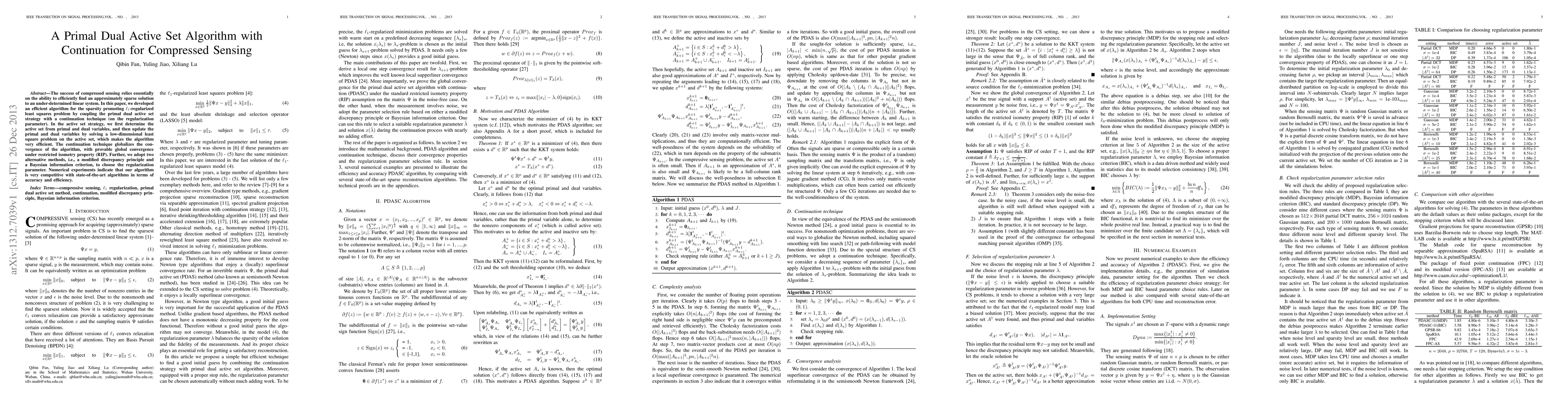 This paper proposes an efficient primal dual active set algorithm with continuation for solving the $\ell_1$-regularized least squares problem in compressed sensing. The algorithm combines an active set strategy with a regularization parameter continuation technique, ensuring global convergence under the restricted isometry property, and demonstrates competitive accuracy and efficiency in numerical experiments.