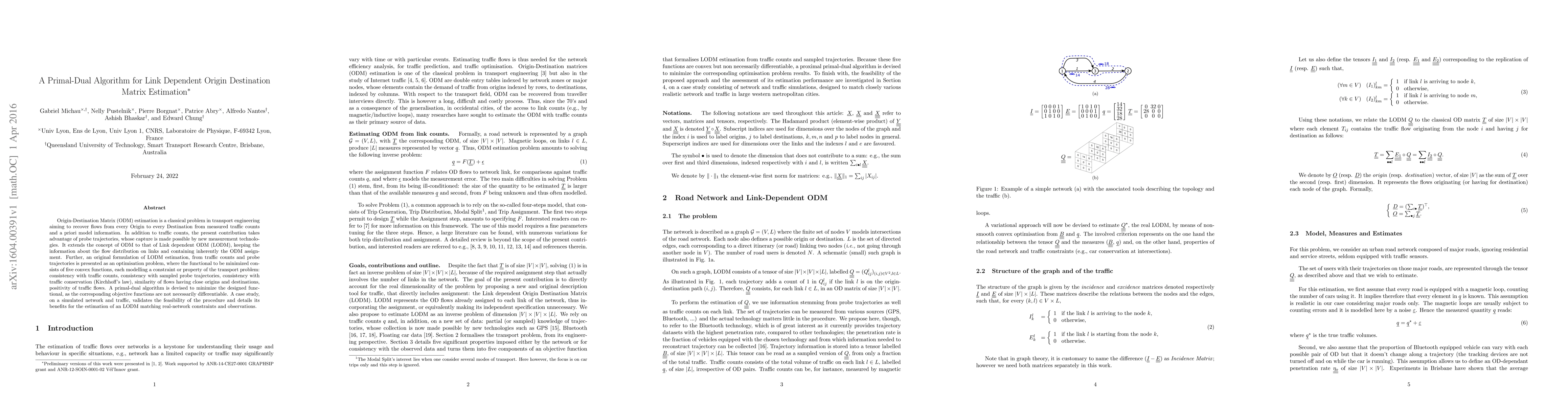 This paper presents a primal-dual algorithm for estimating Link Dependent Origin Destination Matrices (LODM) using traffic counts and probe trajectories. The LODM extends traditional ODM to include link-specific flow information, and the algorithm minimizes a functional with five convex constraints to achieve accurate estimations.