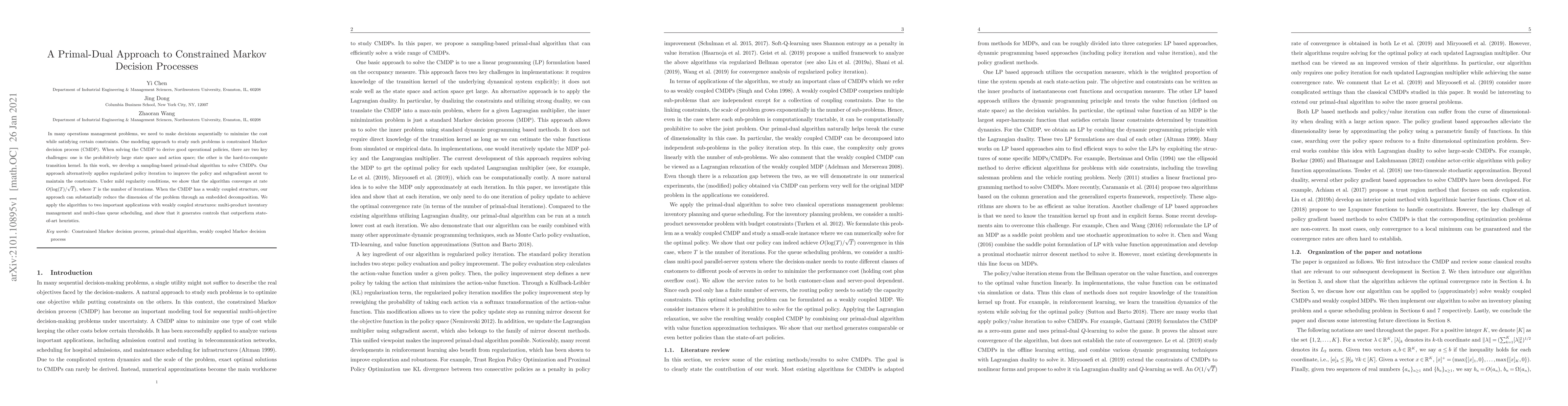 In many operations management problems, we need to make decisions sequentially to minimize the cost while satisfying certain constraints. One modeling approach to study such problems is constrained Markov decision process (CMDP). When solving the CMDP to derive good operational policies, there are two key challenges: one is the prohibitively large state space and action space; the other is the hard-to-compute transition kernel. In this work, we develop a sampling-based primal-dual algorithm to solve CMDPs. Our approach alternatively applies regularized policy iteration to improve the policy and subgradient ascent to maintain the constraints. Under mild regularity conditions, we show that the algorithm converges at rate $ O(\log(T)/\sqrt{T})$, where T is the number of iterations. When the CMDP has a weakly coupled structure, our approach can substantially reduce the dimension of the problem through an embedded decomposition. We apply the algorithm to two important applications with weakly coupled structures: multi-product inventory management and multi-class queue scheduling, and show that it generates controls that outperform state-of-art heuristics.