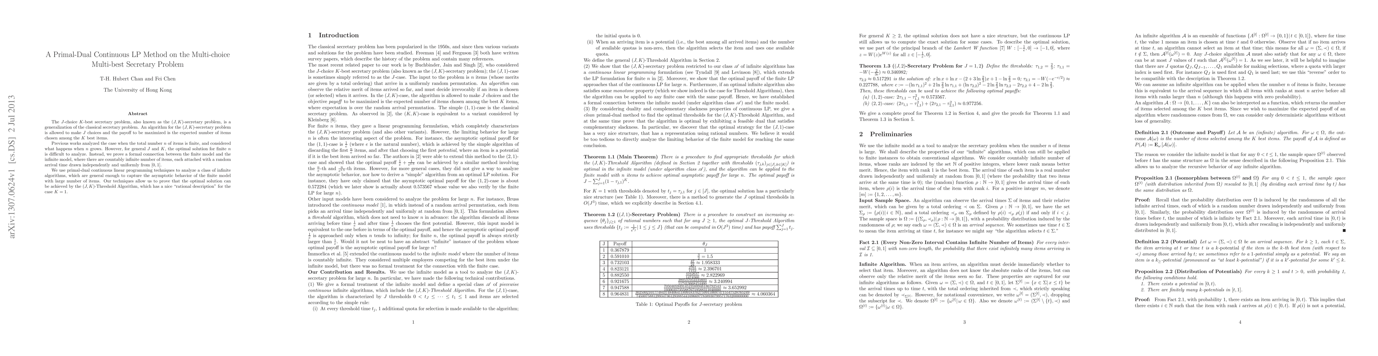 The J-choice K-best secretary problem, also known as the (J,K)-secretary problem, is a generalization of the classical secretary problem. An algorithm for the (J,K)-secretary problem is allowed to make J choices and the payoff to be maximized is the expected number of items chosen among the K best items. Previous works analyzed the case when the total number n of items is finite, and considered what happens when n grows. However, for general J and K, the optimal solution for finite n is difficult to analyze. Instead, we prove a formal connection between the finite model and the infinite model, where there are countably infinite number of items, each attached with a random arrival time drawn independently and uniformly from [0,1]. We use primal-dual continuous linear programming techniques to analyze a class of infinite algorithms, which are general enough to capture the asymptotic behavior of the finite model with large number of items. Our techniques allow us to prove that the optimal solution can be achieved by the (J,K)-Threshold Algorithm, which has a nice "rational description" for the case K = 1.