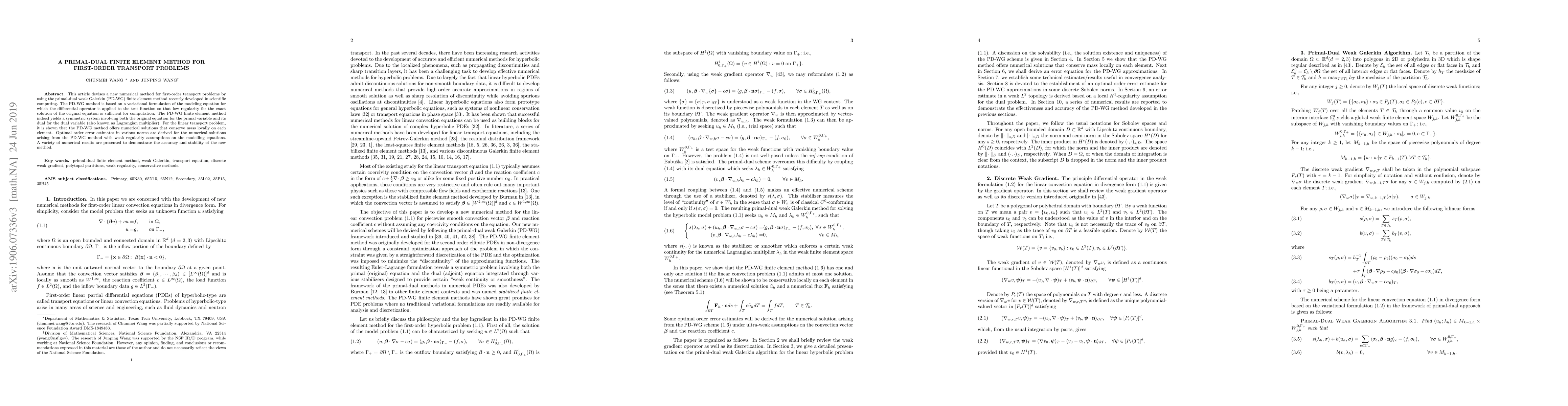 The paper proposes a primal-dual weak Galerkin finite element method (PD-WG) for solving first-order transport problems, which conserves mass locally and achieves optimal error estimates under weak regularity assumptions. Numerical results show the method's accuracy and stability.