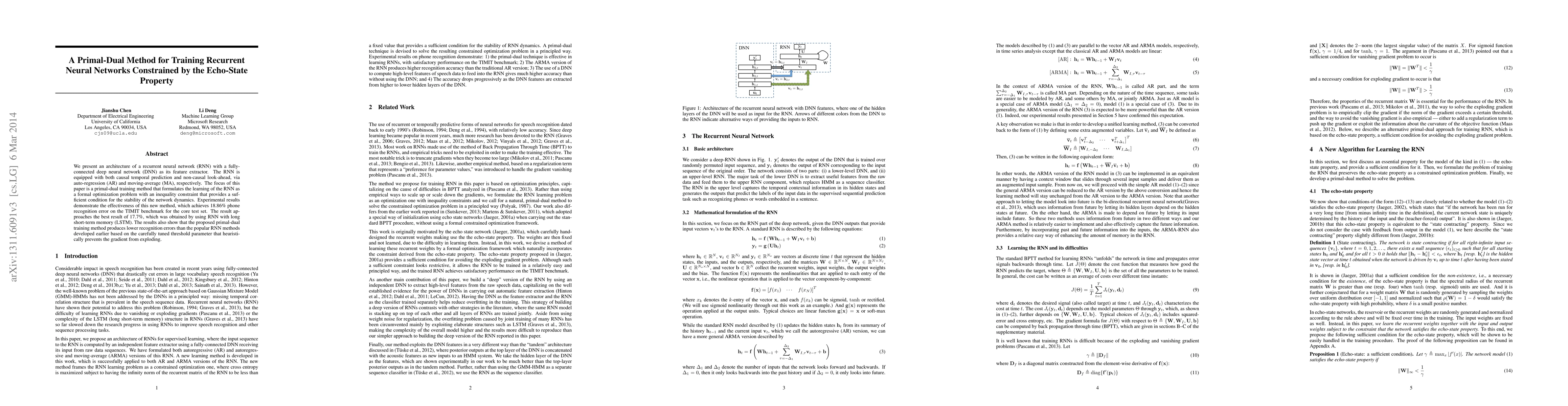 We present an architecture of a recurrent neural network (RNN) with a fully-connected deep neural network (DNN) as its feature extractor. The RNN is equipped with both causal temporal prediction and non-causal look-ahead, via auto-regression (AR) and moving-average (MA), respectively. The focus of this paper is a primal-dual training method that formulates the learning of the RNN as a formal optimization problem with an inequality constraint that provides a sufficient condition for the stability of the network dynamics. Experimental results demonstrate the effectiveness of this new method, which achieves 18.86% phone recognition error on the TIMIT benchmark for the core test set. The result approaches the best result of 17.7%, which was obtained by using RNN with long short-term memory (LSTM). The results also show that the proposed primal-dual training method produces lower recognition errors than the popular RNN methods developed earlier based on the carefully tuned threshold parameter that heuristically prevents the gradient from exploding.