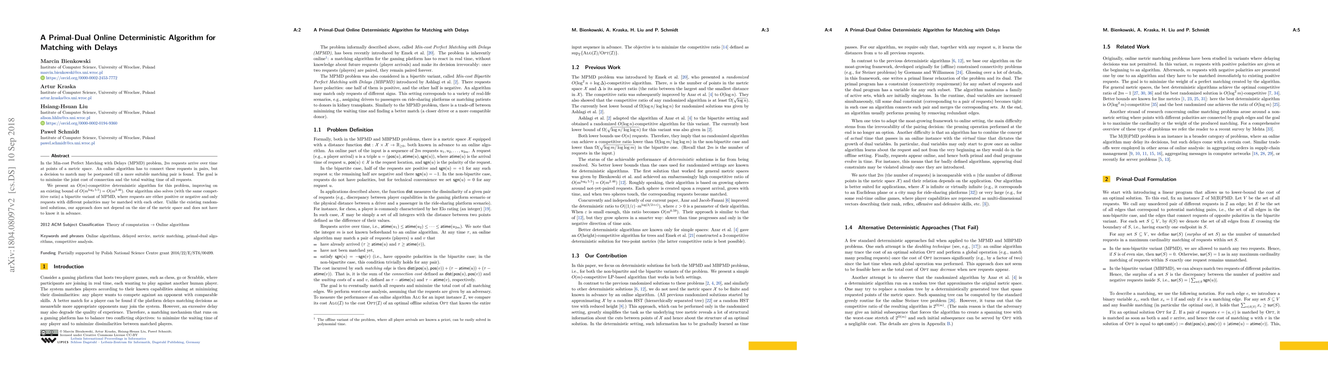 In the Min-cost Perfect Matching with Delays (MPMD) problem, 2 m requests arrive over time at points of a metric space. An online algorithm has to connect these requests in pairs, but a decision to match may be postponed till a more suitable matching pair is found. The goal is to minimize the joint cost of connection and the total waiting time of all requests. We present an O(m)-competitive deterministic algorithm for this problem, improving on an existing bound of O(m^(log(5.5))) = O(m^2.46). Our algorithm also solves (with the same competitive ratio) a bipartite variant of MPMD, where requests are either positive or negative and only requests with different polarities may be matched with each other. Unlike the existing randomized solutions, our approach does not depend on the size of the metric space and does not have to know it in advance.