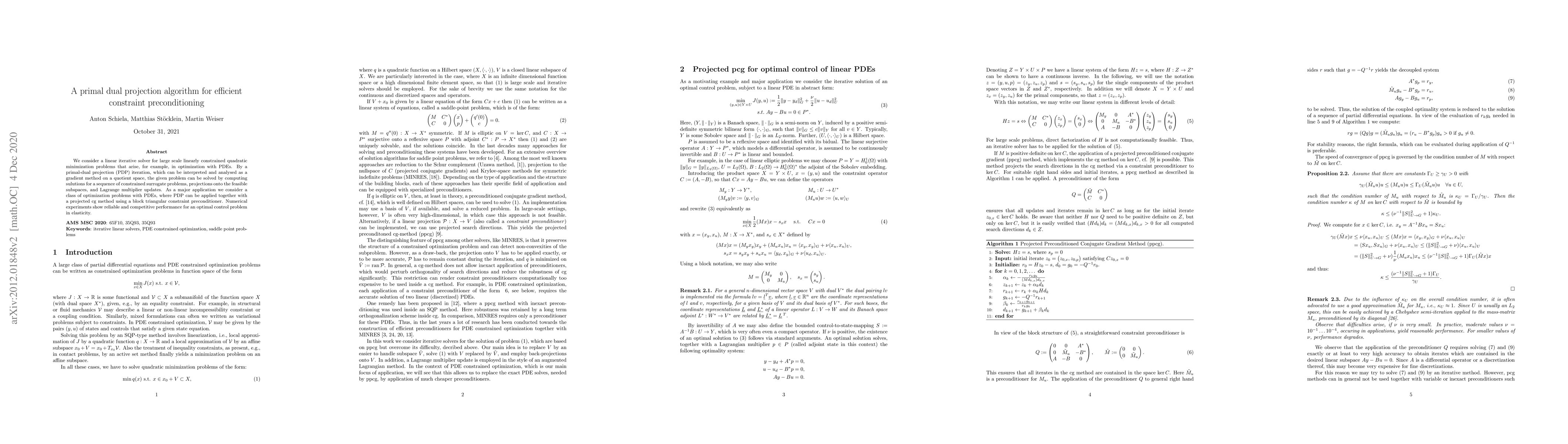 We consider a linear iterative solver for large scale linearly constrained quadratic minimization problems that arise, for example, in optimization with PDEs. By a primal-dual projection (PDP) iteration, which can be interpreted and analysed as a gradient method on a quotient space, the given problem can be solved by computing sulutions for a sequence of constrained surrogate problems, projections onto the feasible subspaces, and Lagrange multiplier updates. As a major application we consider a class of optimization problems with PDEs, where PDP can be applied together with a projected cg method using a block triangular constraint preconditioner. Numerical experiments show reliable and competitive performance for an optimal control problem in elasticity.