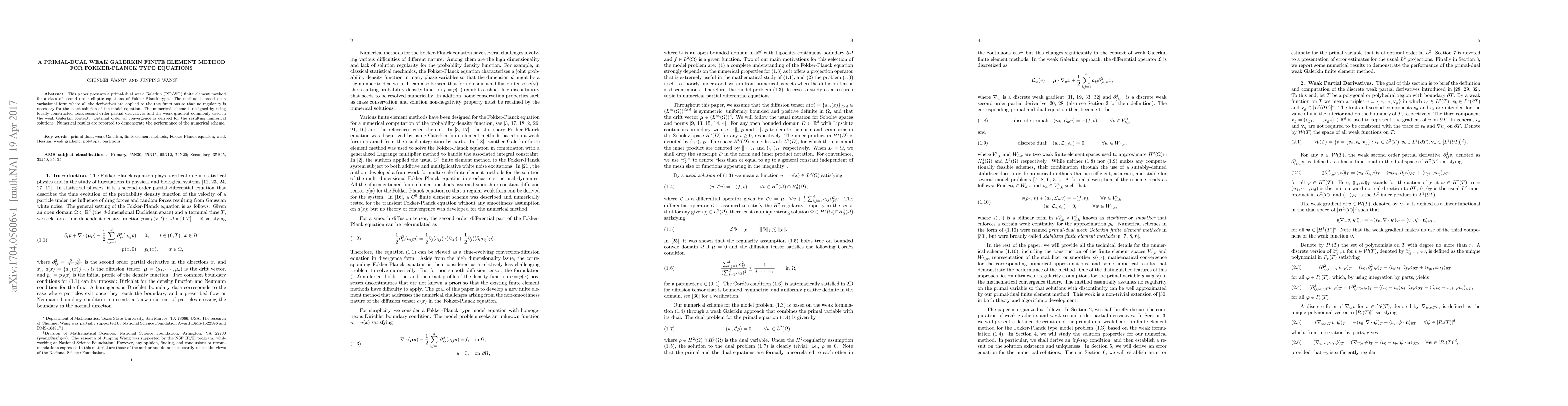 This paper presents a primal-dual weak Galerkin (PD-WG) finite element method for a class of second order elliptic equations of Fokker-Planck type. The method is based on a variational form where all the derivatives are applied to the test functions so that no regularity is necessary for the exact solution of the model equation. The numerical scheme is designed by using locally constructed weak second order partial derivatives and the weak gradient commonly used in the weak Galerkin context. Optimal order of convergence is derived for the resulting numerical solutions. Numerical results are reported to demonstrate the performance of the numerical scheme.