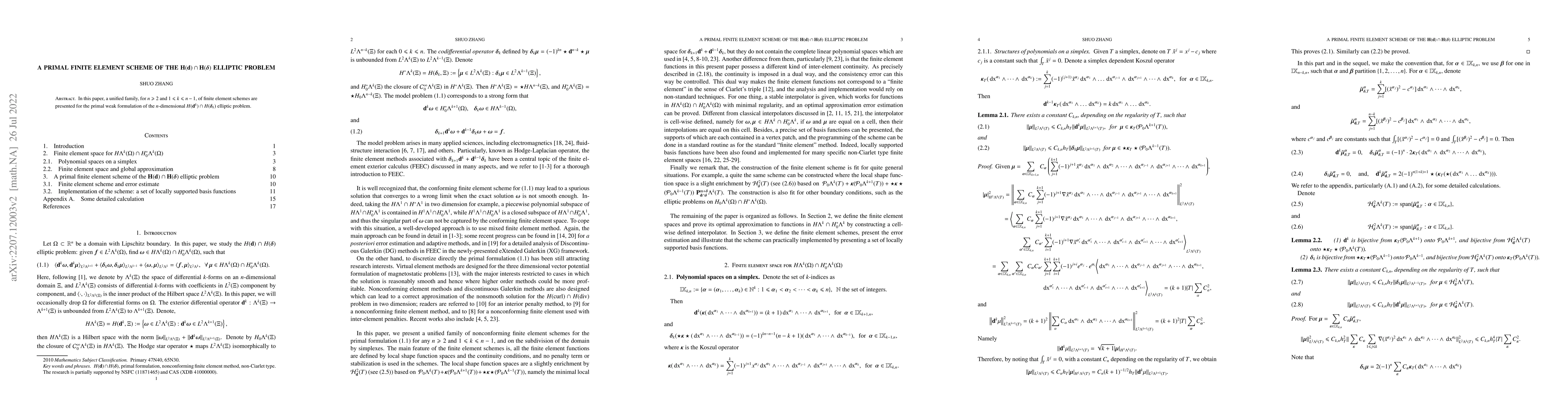 This paper introduces a unified family of primal finite element schemes for the weak formulation of $n$-dimensional $H(\mathbf{d}^k)\cap H(\boldsymbol{\delta}_k)$ elliptic problems, applicable for $n\geqslant2$ and $1\leqslant k\leqslant n-1$. The schemes aim to provide robust solutions for these complex elliptic problems.