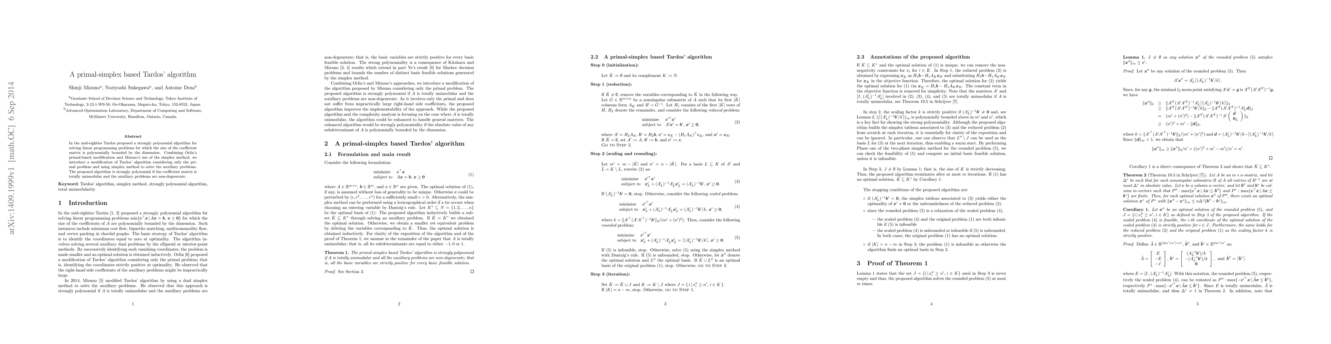 Summary: This paper modifies Tardos' strongly polynomial algorithm for linear programming by integrating Orlin's primal-based approach and the simplex method, enhancing its efficiency under the conditions that the coefficient matrix is totally unimodular and auxiliary problems are non-degenerate.