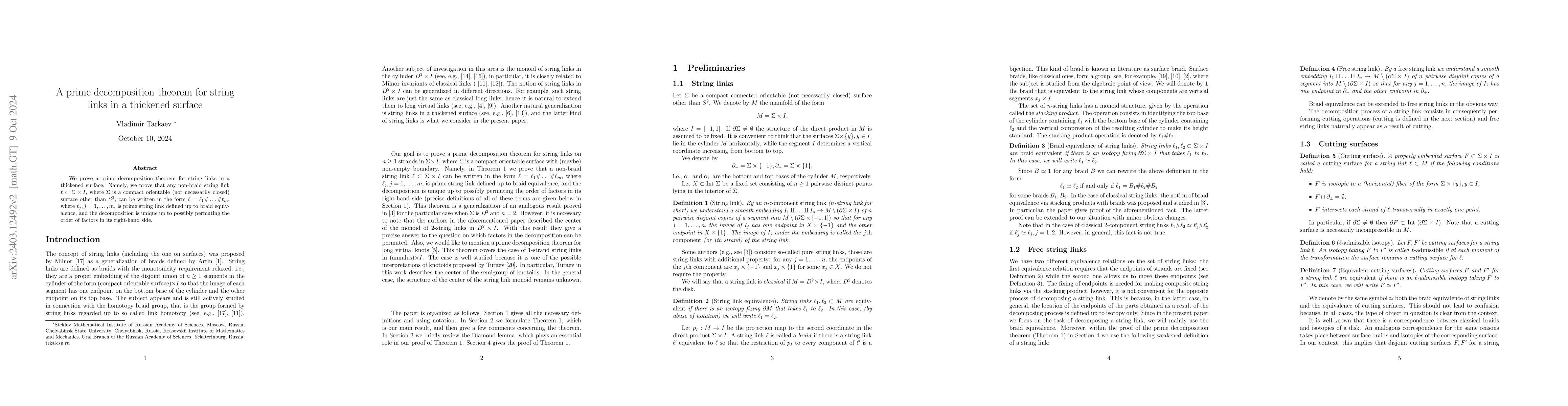 This paper proves a prime decomposition theorem for string links in a thickened surface, demonstrating that any non-braid string link can be uniquely decomposed into prime string links up to braid-equivalence and permutation of components.
