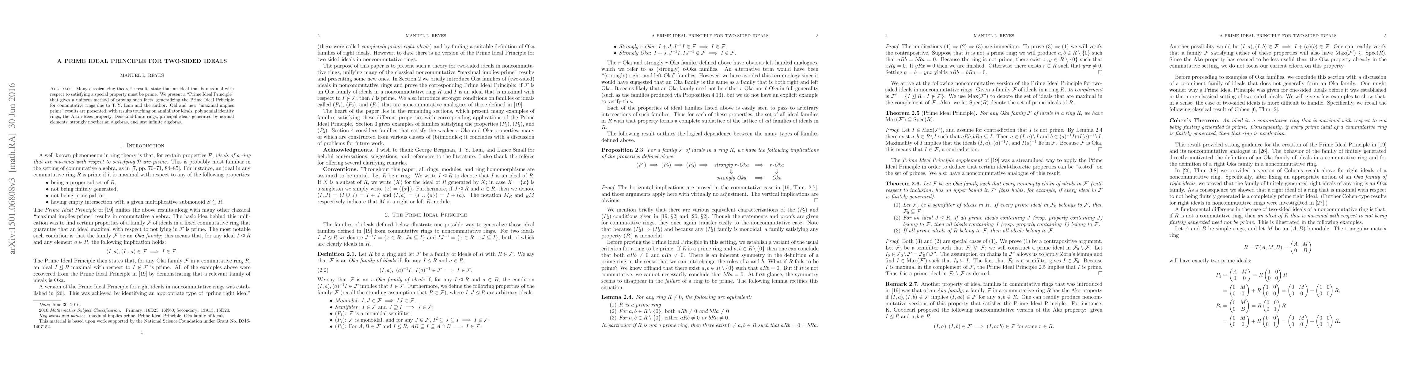 The paper presents a 'Prime Ideal Principle' for two-sided ideals in rings, generalizing previous results for commutative rings.