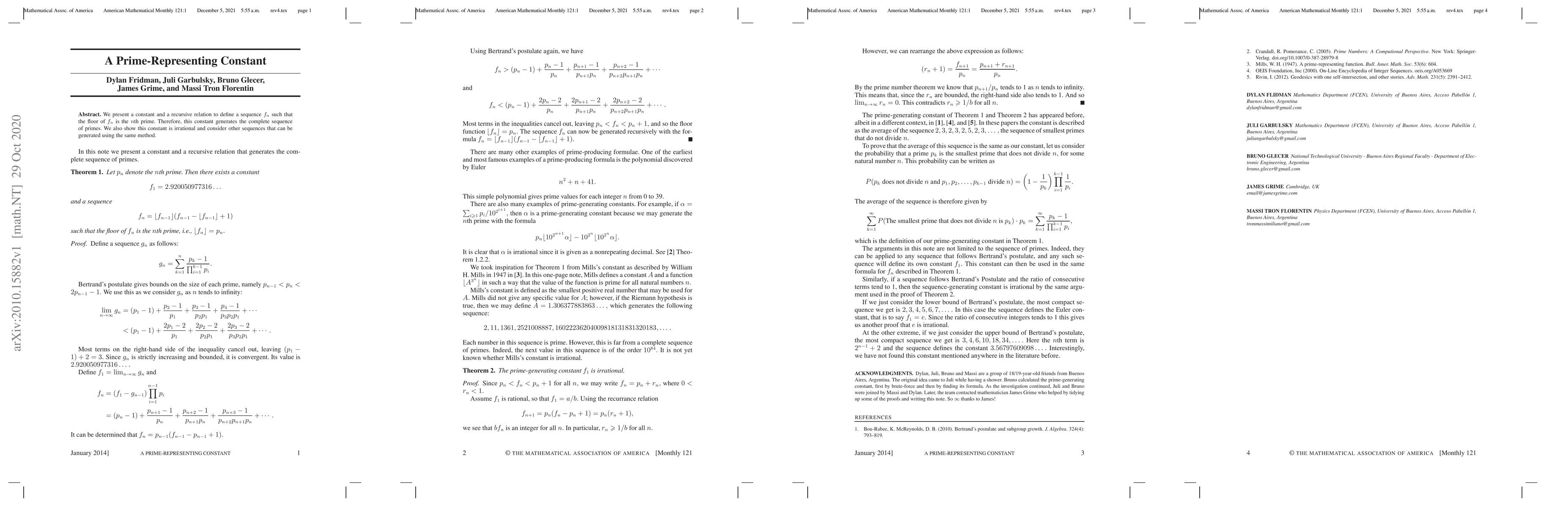 We present a constant and a recursive relation to define a sequence $f_n$ such that the floor of $f_n$ is the $n$th prime. Therefore, this constant generates the complete sequence of primes. We also show this constant is irrational and consider other sequences that can be generated using the same method.