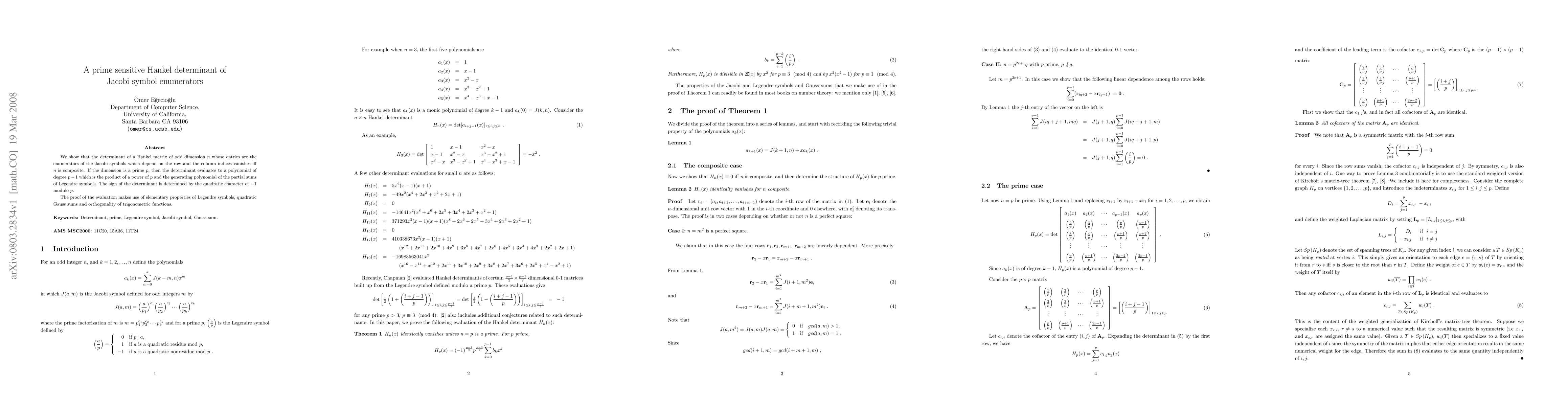 We show that the determinant of a Hankel matrix of odd dimension n whose entries are the enumerators of the Jacobi symbols which depend on the row and the column indices vanishes iff n is composite. If the dimension is a prime p, then the determinant evaluates to a polynomial of degree p-1 which is the product of a power of p and the generating polynomial of the partial sums of Legendre symbols. The sign of the determinant is determined by the quadratic character of -1 modulo p. The proof of the evaluation makes use of elementary properties of Legendre symbols, quadratic Gauss sums and orthogonality of trigonometric functions.