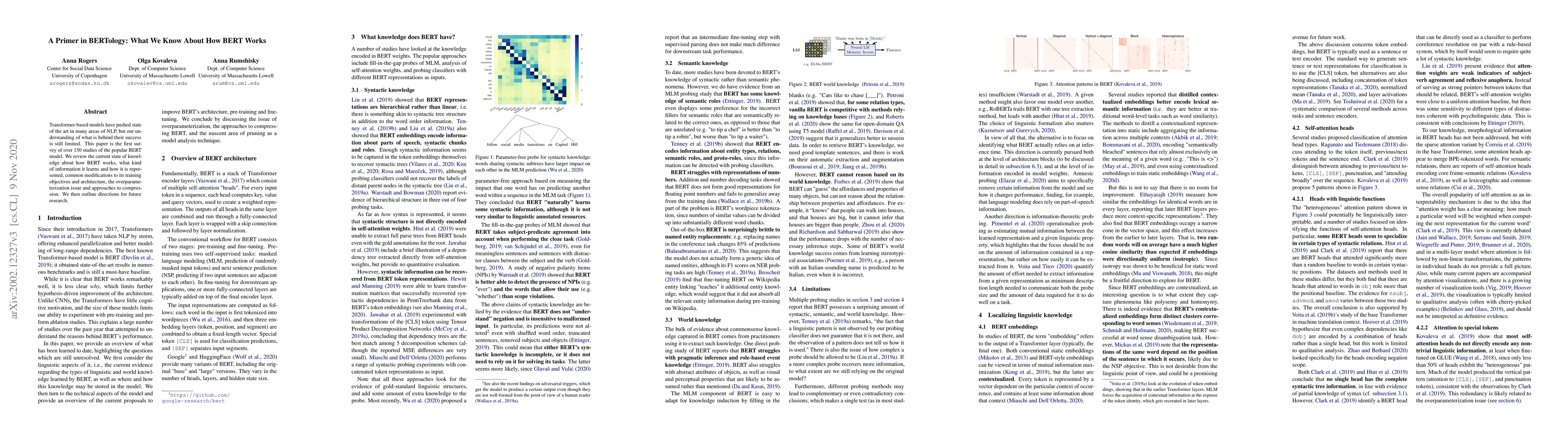 Transformer-based models have pushed state of the art in many areas of NLP, but our understanding of what is behind their success is still limited. This paper is the first survey of over 150 studies of the popular BERT model. We review the current state of knowledge about how BERT works, what kind of information it learns and how it is represented, common modifications to its training objectives and architecture, the overparameterization issue and approaches to compression. We then outline directions for future research.