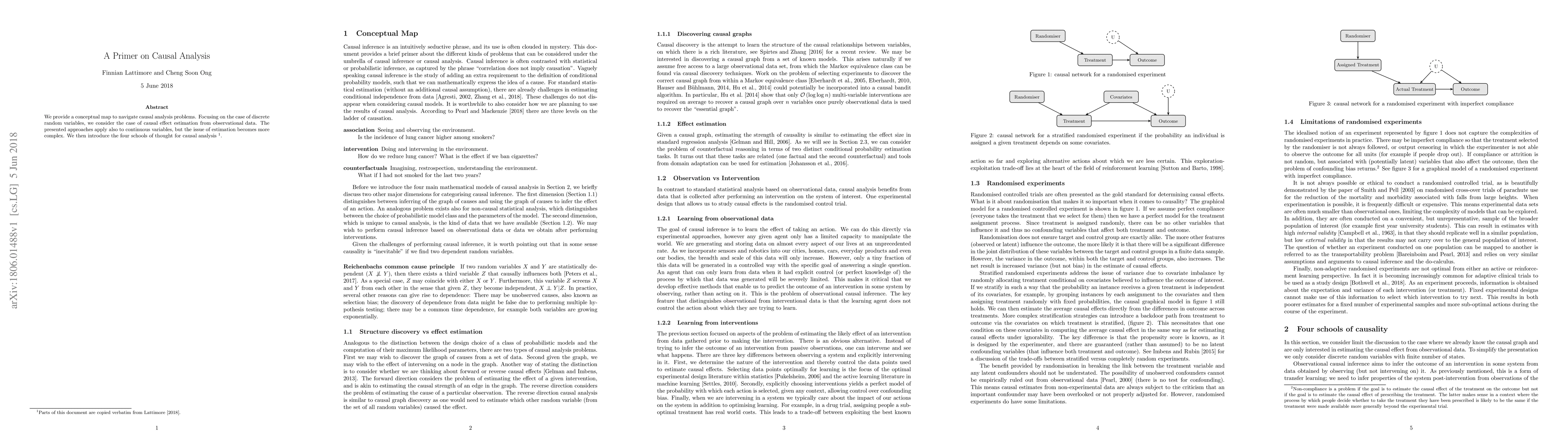 We provide a conceptual map to navigate causal analysis problems. Focusing on the case of discrete random variables, we consider the case of causal effect estimation from observational data. The presented approaches apply also to continuous variables, but the issue of estimation becomes more complex. We then introduce the four schools of thought for causal analysis
