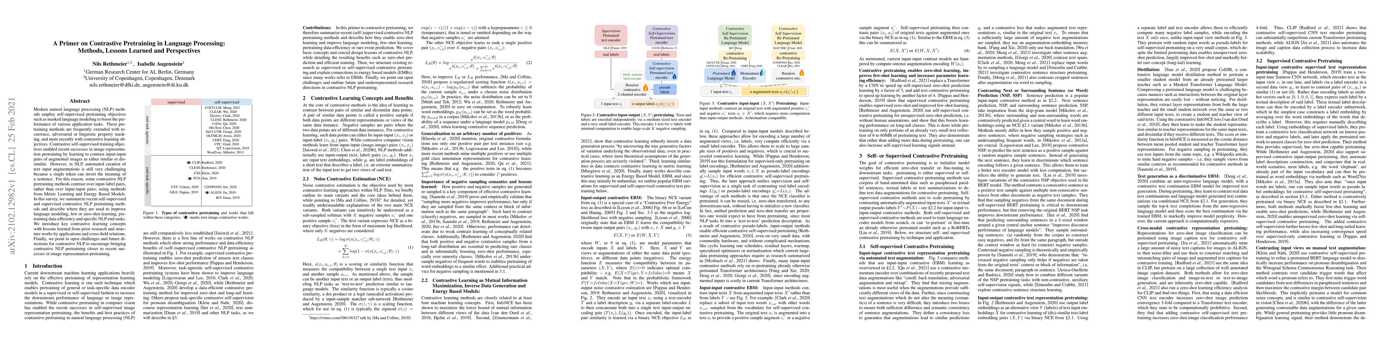 This paper surveys recent advancements in contrastive pretraining for natural language processing, highlighting methods, lessons learned, and future directions. It discusses how contrastive learning, originally successful in image representation, faces challenges in NLP due to the complexity of text augmentation, and explores its applications in improving language modeling and various NLP tasks.