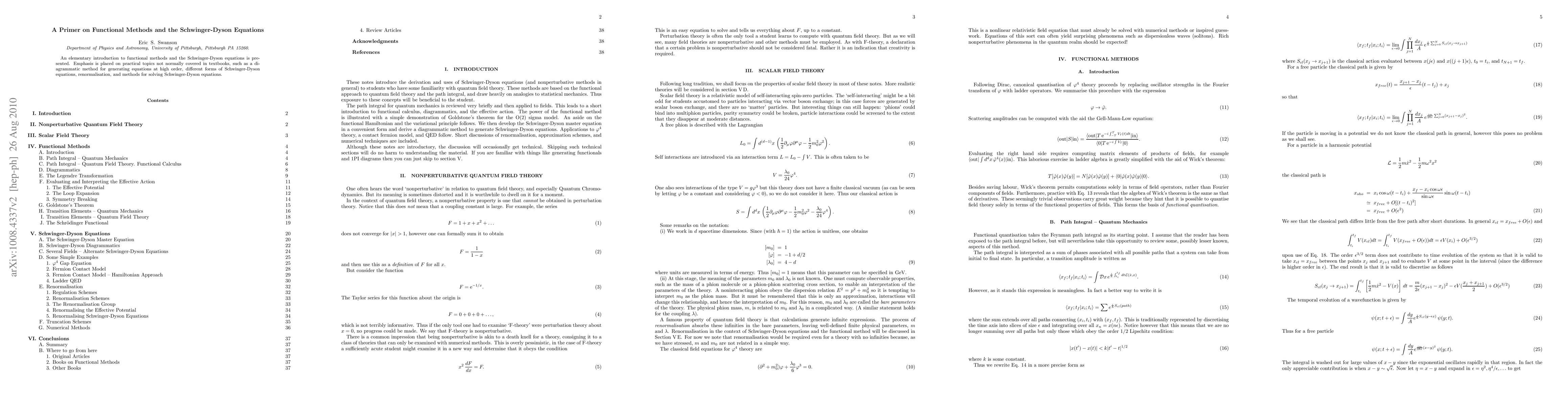 This paper provides an accessible introduction to functional methods and Schwinger-Dyson equations, focusing on practical topics like advanced diagrammatic techniques, various Schwinger-Dyson forms, renormalization, and solving methods. It aims to fill gaps in standard textbook coverage.