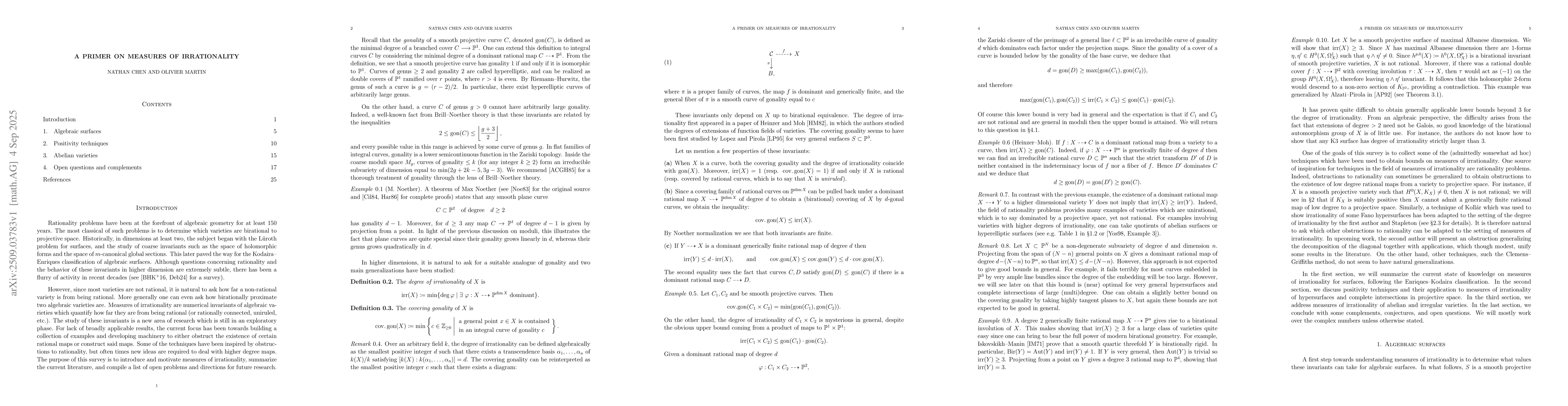 Measures of irrationality are a numerical way of quantifying how far a given variety is from being rational (or rationally connected, uniruled, etc.). In the last two decades, there has been renewed interest in the study of these invariants. The goal of this expository survey is to summarize known results from the point of view of the Kodaira--Enriques classification of surfaces, highlight recent progress, and discuss a number of open problems and questions.
