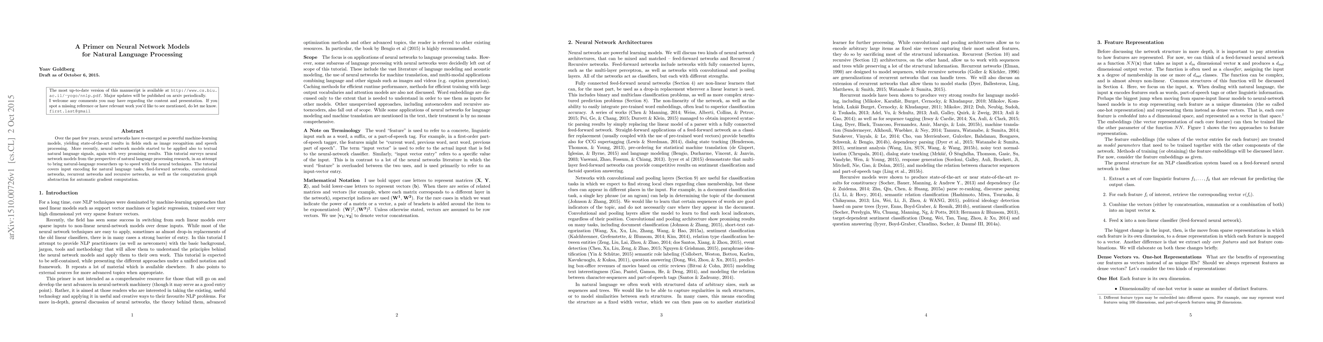 Over the past few years, neural networks have re-emerged as powerful machine-learning models, yielding state-of-the-art results in fields such as image recognition and speech processing. More recently, neural network models started to be applied also to textual natural language signals, again with very promising results. This tutorial surveys neural network models from the perspective of natural language processing research, in an attempt to bring natural-language researchers up to speed with the neural techniques. The tutorial covers input encoding for natural language tasks, feed-forward networks, convolutional networks, recurrent networks and recursive networks, as well as the computation graph abstraction for automatic gradient computation.