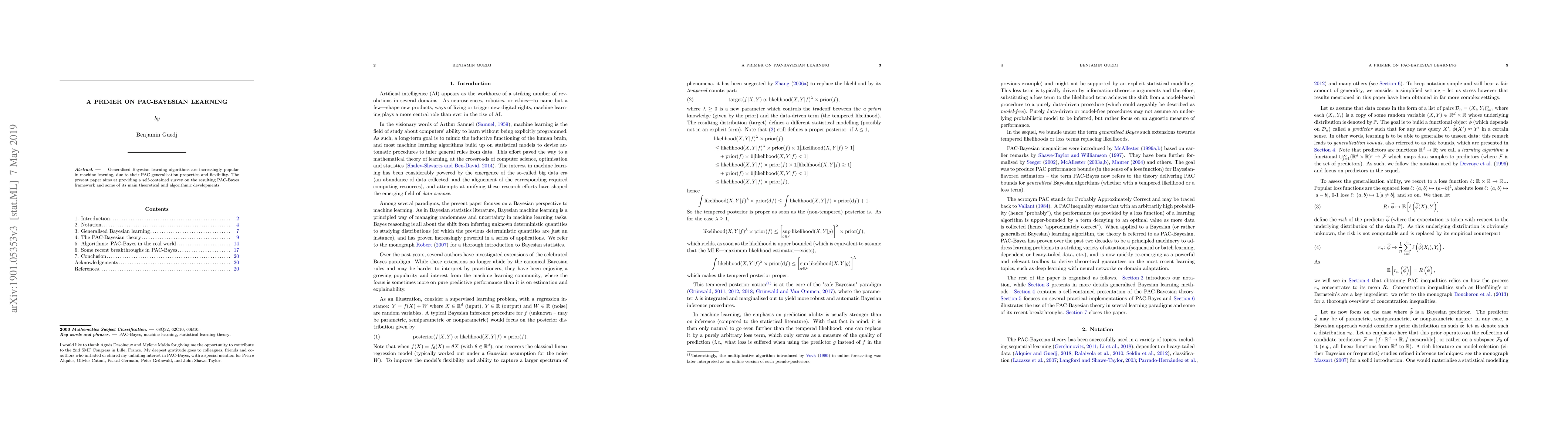 Generalised Bayesian learning algorithms are increasingly popular in machine learning, due to their PAC generalisation properties and flexibility. The present paper aims at providing a self-contained survey on the resulting PAC-Bayes framework and some of its main theoretical and algorithmic developments.