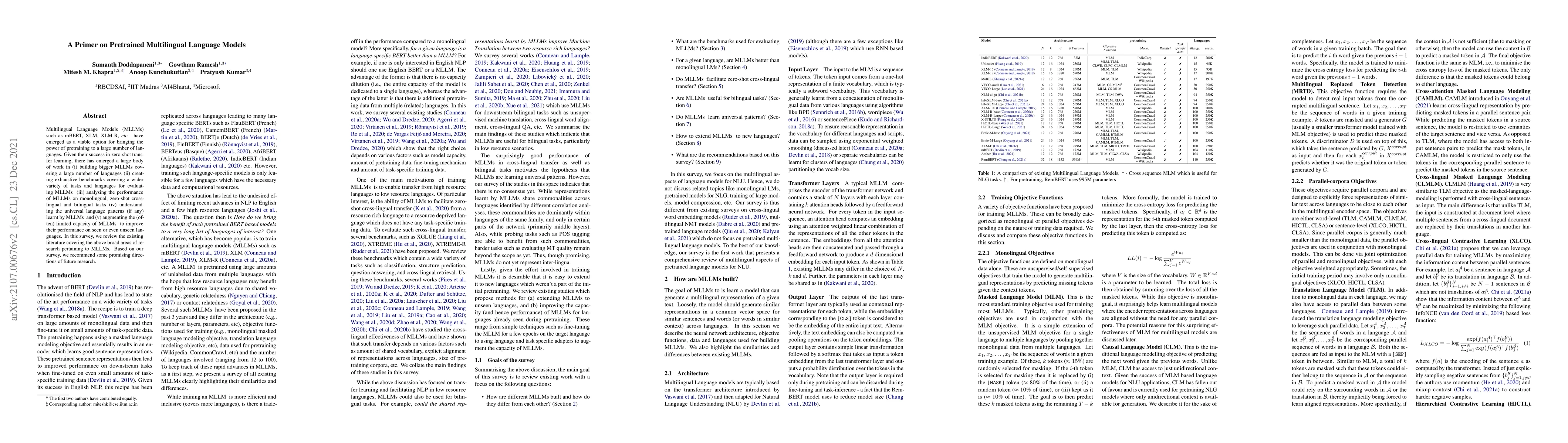 Multilingual Language Models (\MLLMs) such as mBERT, XLM, XLM-R, \textit{etc.} have emerged as a viable option for bringing the power of pretraining to a large number of languages. Given their success in zero-shot transfer learning, there has emerged a large body of work in (i) building bigger \MLLMs~covering a large number of languages (ii) creating exhaustive benchmarks covering a wider variety of tasks and languages for evaluating \MLLMs~ (iii) analysing the performance of \MLLMs~on monolingual, zero-shot cross-lingual and bilingual tasks (iv) understanding the universal language patterns (if any) learnt by \MLLMs~ and (v) augmenting the (often) limited capacity of \MLLMs~ to improve their performance on seen or even unseen languages. In this survey, we review the existing literature covering the above broad areas of research pertaining to \MLLMs. Based on our survey, we recommend some promising directions of future research.