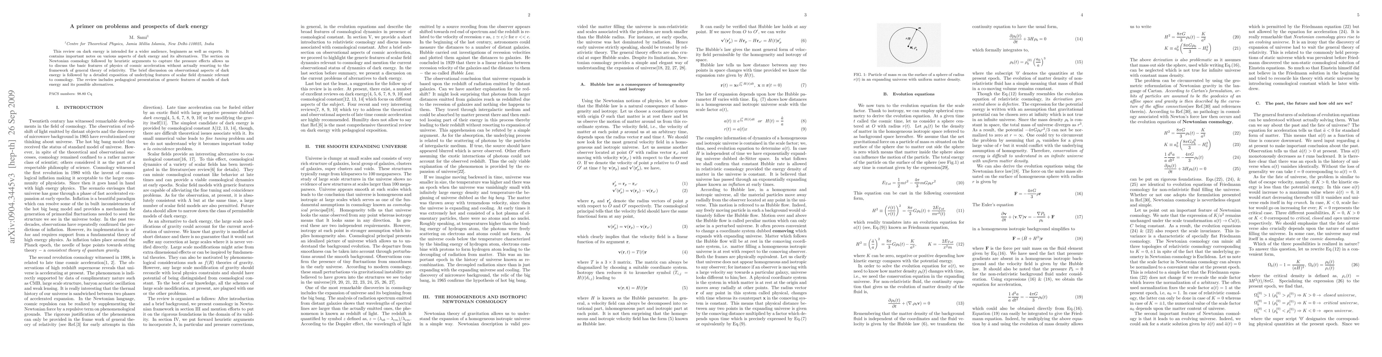 This review provides an accessible overview of dark energy, including Newtonian cosmology and heuristic arguments for cosmic acceleration, alongside observational aspects and detailed discussions on scalar field dynamics and alternative models. It aims to educate both beginners and experts on the fundamental physics and current understanding of dark energy.