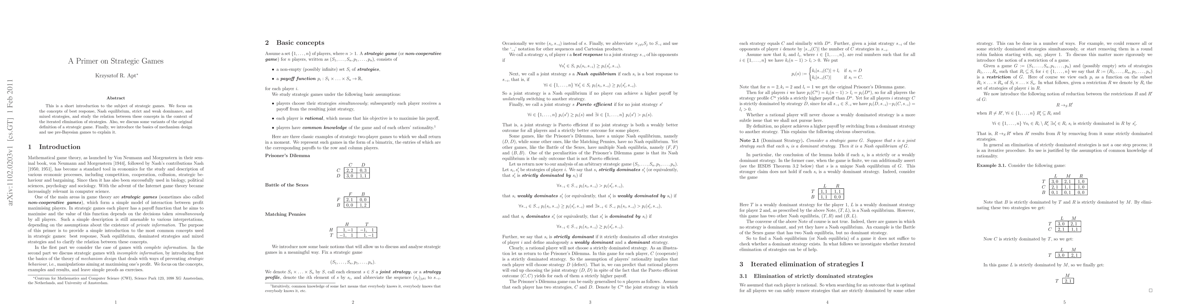 This paper provides an introduction to strategic games, covering best response, Nash equilibrium, dominance, and mixed strategies. It explores their relationships through the iterated elimination of strategies and touches on mechanism design using pre-Bayesian games.