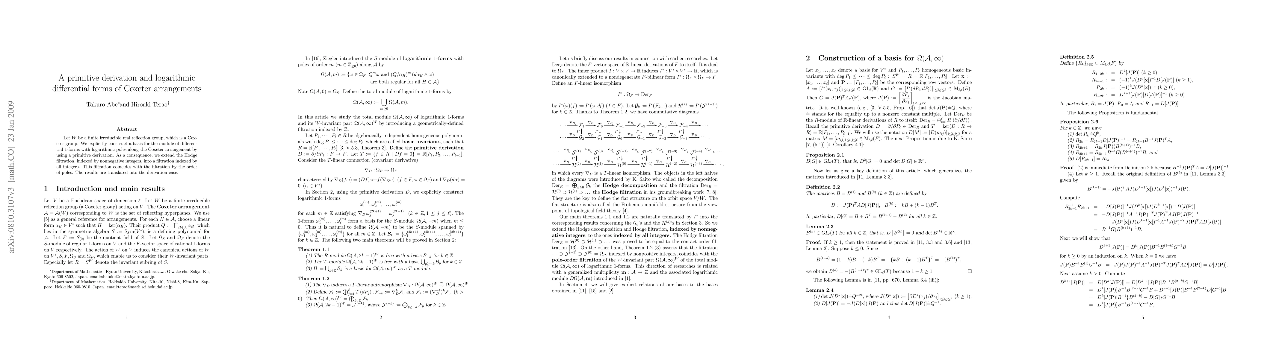 This paper constructs a basis for differential 1-forms with logarithmic poles in Coxeter arrangements using primitive derivations, extending the Hodge filtration to include negative integers, which aligns with the filtration by pole order. The findings are applied to the derivation case.