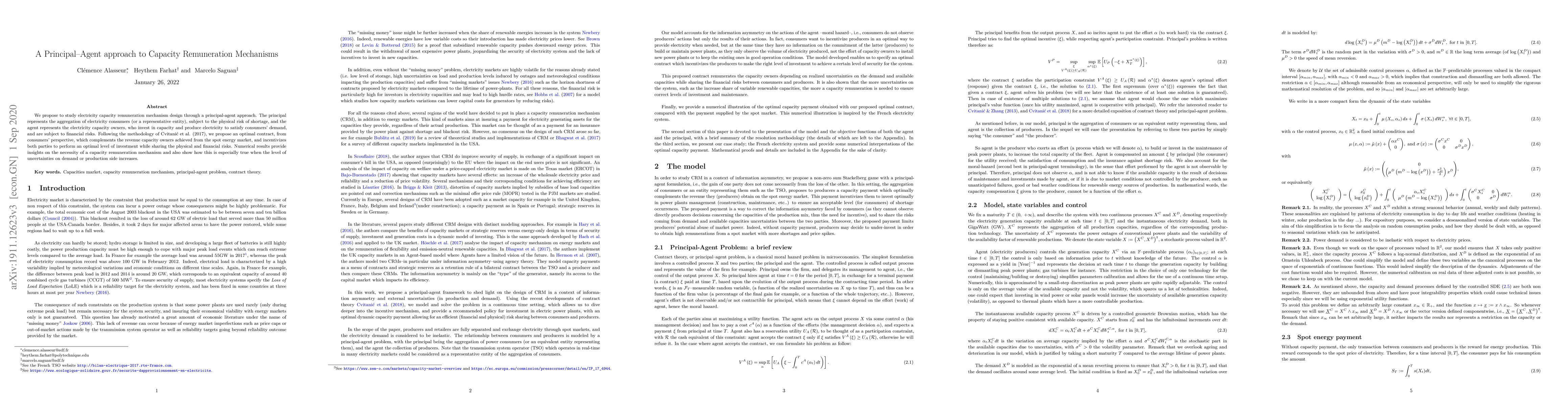 We propose to study electricity capacity remuneration mechanism design through a Principal-Agent approach. The Principal represents the aggregation of electricity consumers (or a representative entity), subject to the physical risk of shortage, and the Agent represents the electricity capacity owners, who invest in capacity and produce electricity to satisfy consumers' demand, and are subject to financial risks. Following the methodology of Cvitanic et al. (2017), we propose an optimal contract, from consumers' perspective, which complements the revenue capacity owners achieved from the spot energy market, and incentivizes both parties to perform an optimal level of investments while sharing the physical and financial risks. Numerical results provide insights on the necessity of a capacity remuneration mechanism and also show how this is especially true when the level of uncertainties on demand or production side increases.