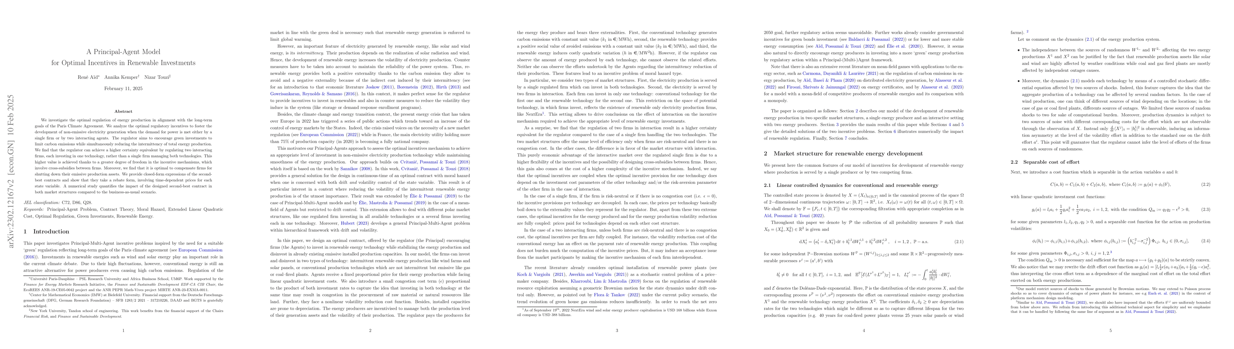This paper develops a principal-agent framework to optimize regulatory incentives for renewable energy investments, comparing monopoly and competitive markets. It finds that competitive markets are more efficient due to greater flexibility in incentive mechanisms, quantified through a numerical study. The study also extends the analysis to a multi-agent setting with controlled diffusion processes, providing closed-form expressions for second-best contracts in rebate form.