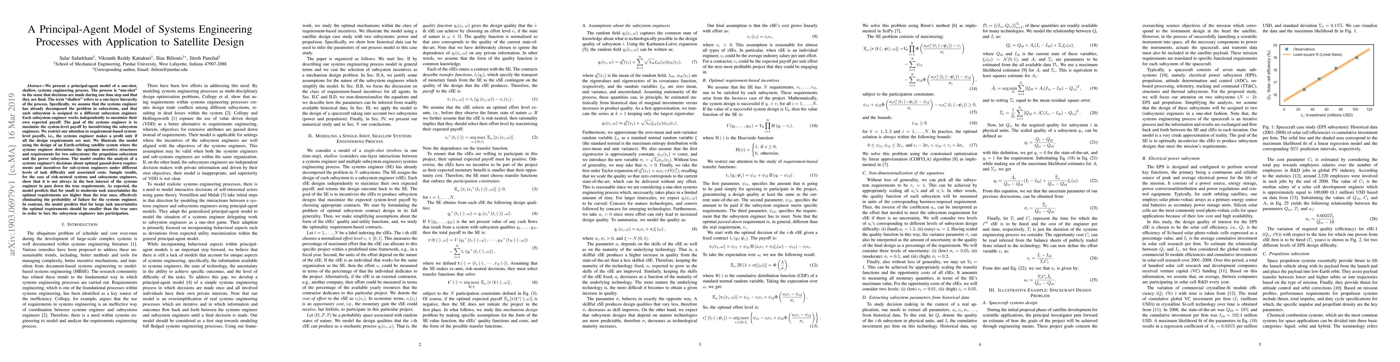 We present a principal-agent model of a one-shot, shallow, systems engineering process. The process is one-shot in the sense that decisions are made during one time step and that they are final. The term shallow refers to a one-layer hierarchy of the process. Specifically, we assume that the systems engineer has already decomposed the problem in subsystems, and that each subsystem is assigned to a different subsystem engineer. Each subsystem engineer works independently to maximize their own expected payoff. The goal of the systems engineer is to maximize the system-level payoff by incentivizing the subsystem engineers. We restrict our attention to requirement-based system-level payoffs, i.e., the systems engineer makes a profit only if all the design requirements are met. We illustrate the model using the design of an Earth-orbiting satellite system where the systems engineer determines the optimum incentive structures and requirements for two subsystems: the propulsion subsystem and the power subsystem. The model enables the analysis of a systems engineer's decisions about optimal passed-down requirements and incentives for sub-system engineers under different levels of task difficulty and associated costs. Sample results, for the case of risk-neutral systems and subsystems engineers, show that it is not always in the best interest of the systems engineer to pass down the true requirements. As expected, the model predicts that for small to moderate task uncertainties the optimal requirements are higher than the true ones, effectively eliminating the probability of failure for the systems engineer. In contrast, the model predicts that for large task uncertainties the optimal requirements should be smaller than the true ones in order to lure the subsystem engineers into participation.