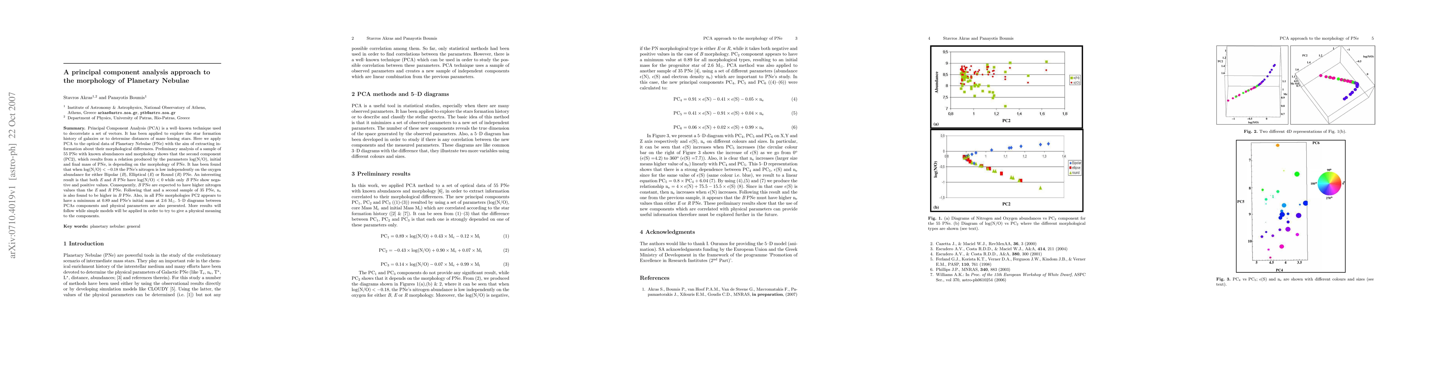 Principal Component Analysis (PCA) is a well-known technique used to decorrelate a set of vectors. It has been applied to explore the star formation history of galaxies or to determine distances of mass-lossing stars. Here we apply PCA to the optical data of Planetary Nebulae (PNe) with the aim of extracting information about their morphological differences. Preliminary analysis of a sample of 55 PNe with known abundances and morphology shows that the second component (PC2), which results from a relation produced by the parameters log(N/O), initial and final mass of PNe, is depending on the morphology of PNe. It has been found that when log(N/O) < -0.18 the PNe's nitrogen is low independently on the oxygen abundance for either Bipolar (B), Elliptical (E) or Round (R) PNe. An interesting result is that both E and R PNe have log(N/O) < 0 while only B PNe show negative and positive values. Consequently, B PNe are expected to have higher nitrogen values than the E and R PNe. Following that and a second sample of 35 PNe, n_{e} is also found to be higher in B PNe. Also, in all PNe morphologies PC2 appears to have a minimum at 0.89 and PNe's initial mass at 2.6 solar masses. 5-D diagrams between PCAs components and physical parameters are also presented. More results will follow while simple models will be applied in order to try to give a physical meaning to the components.