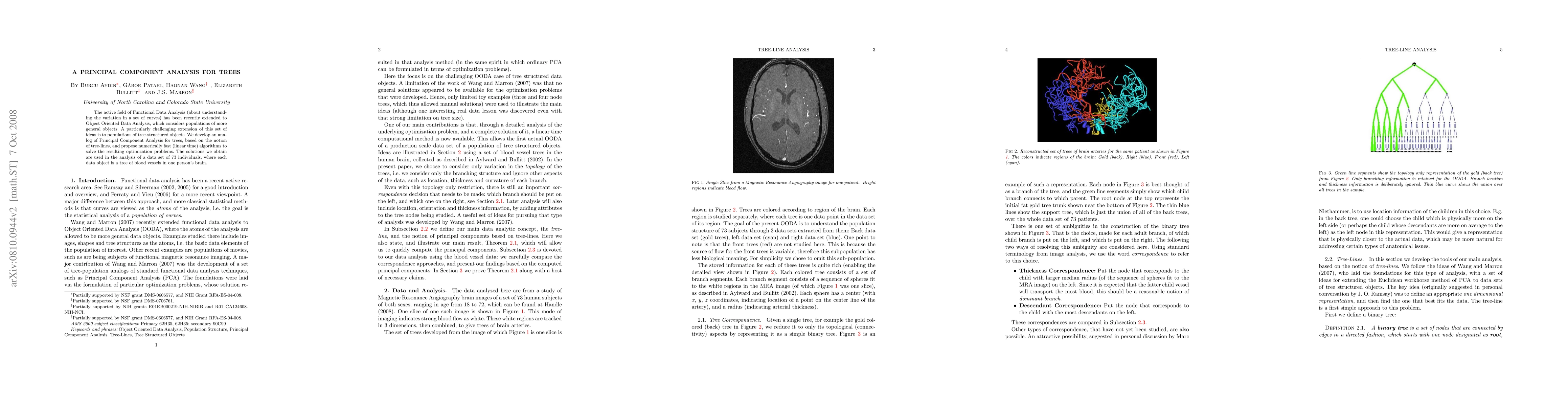 This paper develops a Principal Component Analysis (PCA) analog for tree-structured objects, utilizing tree-lines, and presents efficient linear time algorithms. The method is applied to analyze a dataset of 73 brain blood vessel trees, demonstrating its practical application.