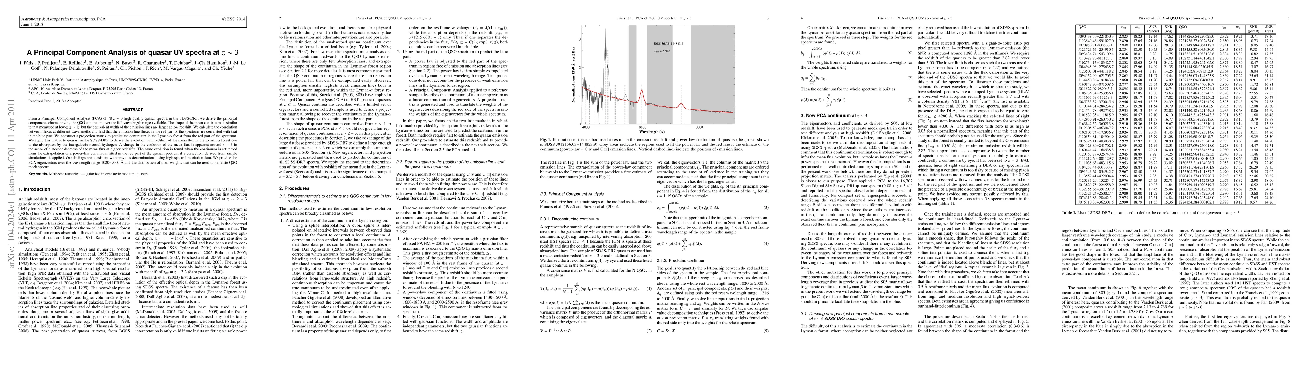This study uses PCA on 78 z~3 quasar spectra to identify principal components characterizing the quasar continuum, revealing a mean continuum shape similar to low-z quasars but with larger emission line widths. The analysis shows a correlation between emission line fluxes across different wavelengths and identifies a change in the Lyman-$\alpha$ forest flux evolution around z~3.