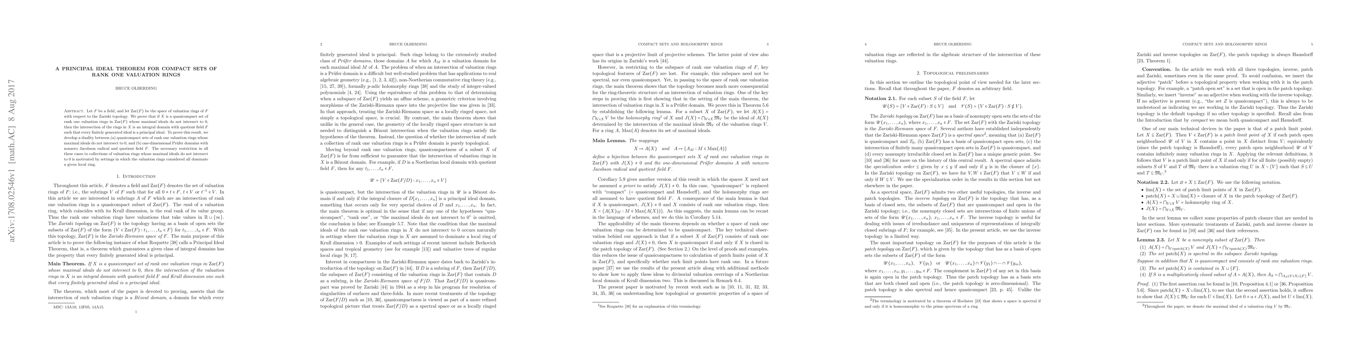 This paper establishes a principal ideal theorem for quasicompact sets of rank one valuation rings in a field $F$, proving that their intersection is an integral domain with every finitely generated ideal being principal. It develops a duality linking such valuation rings to one-dimensional Pr\"ufer domains, under conditions where their maximal ideals do not intersect to $0$.