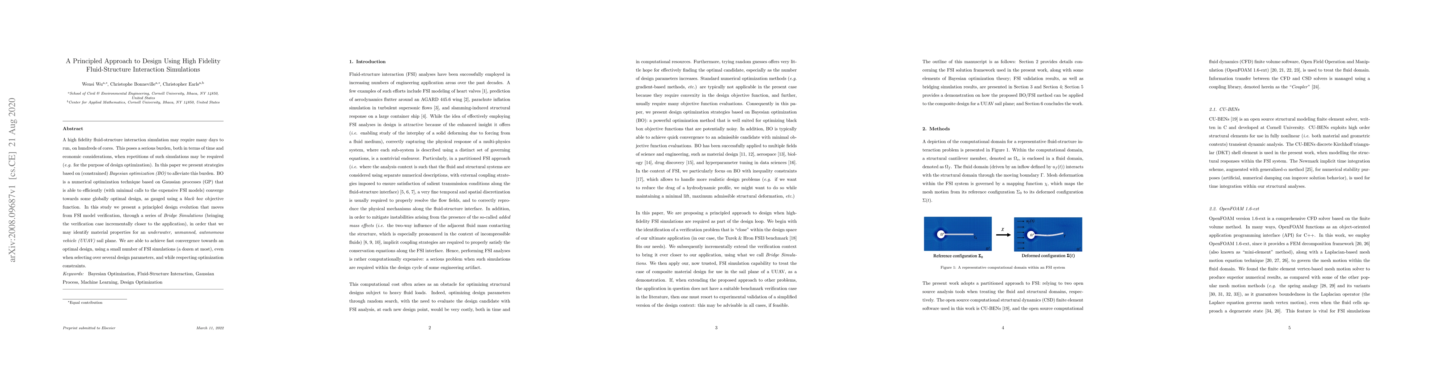 A high fidelity fluid-structure interaction simulation may require many days to run, on hundreds of cores. This poses a serious burden, both in terms of time and economic considerations, when repetitions of such simulations may be required (e.g. for the purpose of design optimization). In this paper we present strategies based on (constrained) Bayesian optimization (BO) to alleviate this burden. BO is a numerical optimization technique based on Gaussian processes (GP) that is able to efficiently (with minimal calls to the expensive FSI models) converge towards some globally optimal design, as gauged using a black box objective function. In this study we present a principled design evolution that moves from FSI model verification, through a series of Bridge Simulations (bringing the verification case incrementally closer to the application), in order that we may identify material properties for an underwater, unmanned, autonomous vehicle (UUAV) sail plane. We are able to achieve fast convergence towards an optimal design, using a small number of FSI simulations (a dozen at most), even when selecting over several design parameters, and while respecting optimization constraints.