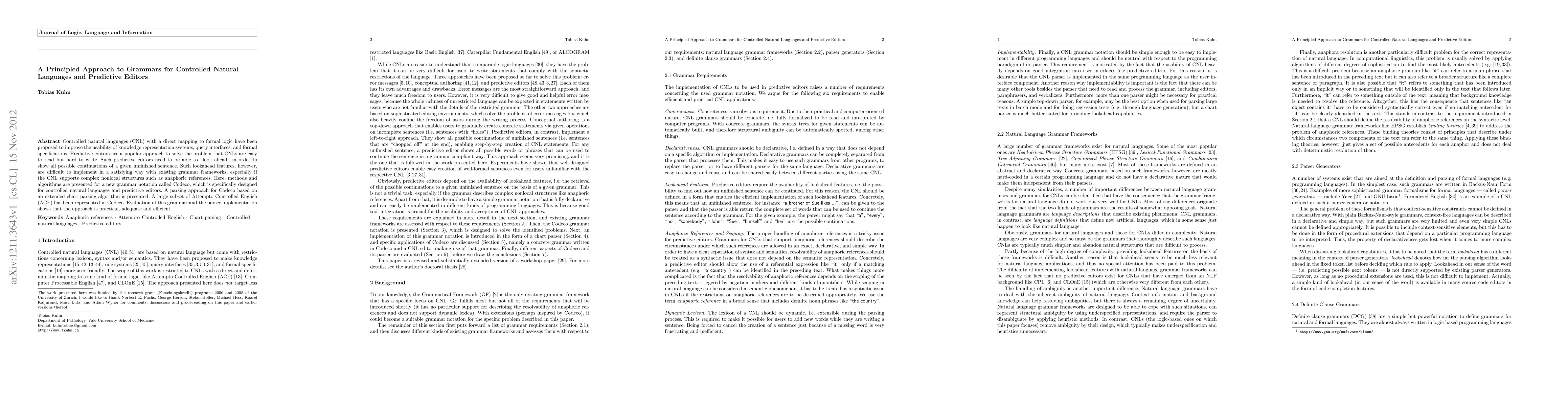 Controlled natural languages (CNL) with a direct mapping to formal logic have been proposed to improve the usability of knowledge representation systems, query interfaces, and formal specifications. Predictive editors are a popular approach to solve the problem that CNLs are easy to read but hard to write. Such predictive editors need to be able to "look ahead" in order to show all possible continuations of a given unfinished sentence. Such lookahead features, however, are difficult to implement in a satisfying way with existing grammar frameworks, especially if the CNL supports complex nonlocal structures such as anaphoric references. Here, methods and algorithms are presented for a new grammar notation called Codeco, which is specifically designed for controlled natural languages and predictive editors. A parsing approach for Codeco based on an extended chart parsing algorithm is presented. A large subset of Attempto Controlled English (ACE) has been represented in Codeco. Evaluation of this grammar and the parser implementation shows that the approach is practical, adequate and efficient.