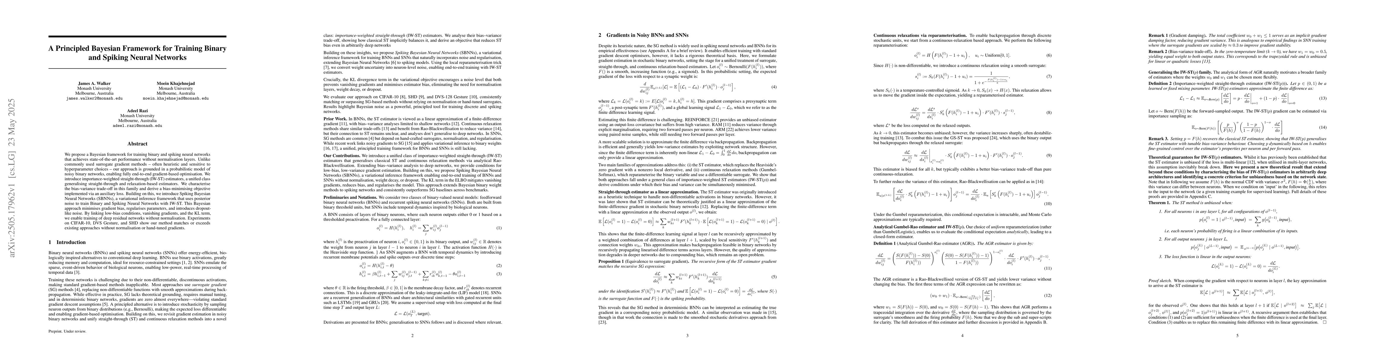 Researchers develop a Bayesian framework for training binary and spiking neural networks without normalization layers, achieving state-of-the-art performance with fully end-to-end gradient-based optimization.