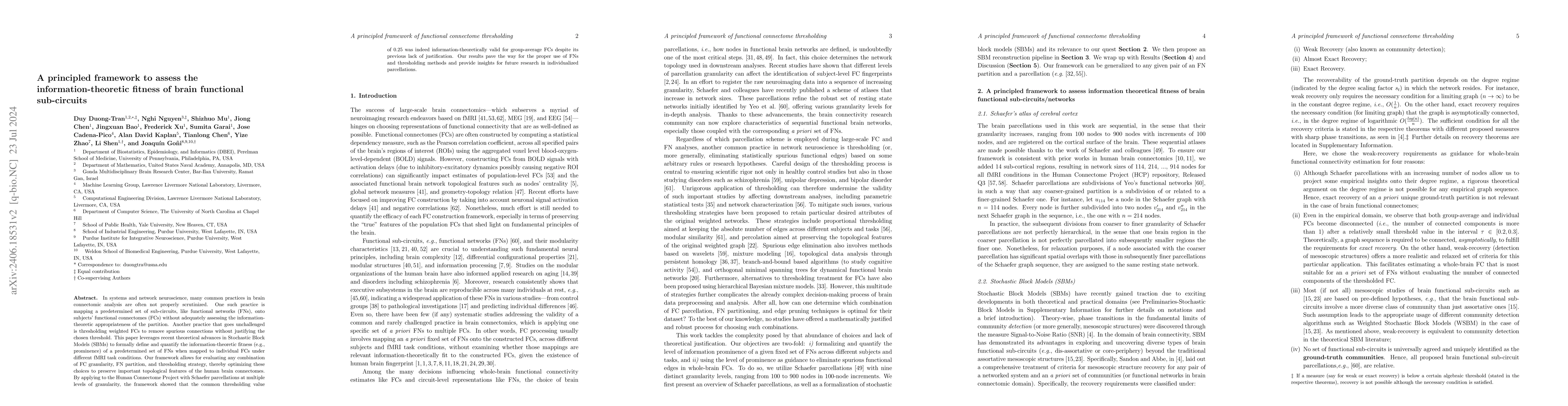 This paper introduces a framework to assess the information-theoretic fitness of functional brain sub-circuits mapped onto individual connectomes, leveraging Stochastic Block Models. It evaluates the appropriateness of functional network partitions and FC thresholding, optimizing these to retain key topological features.