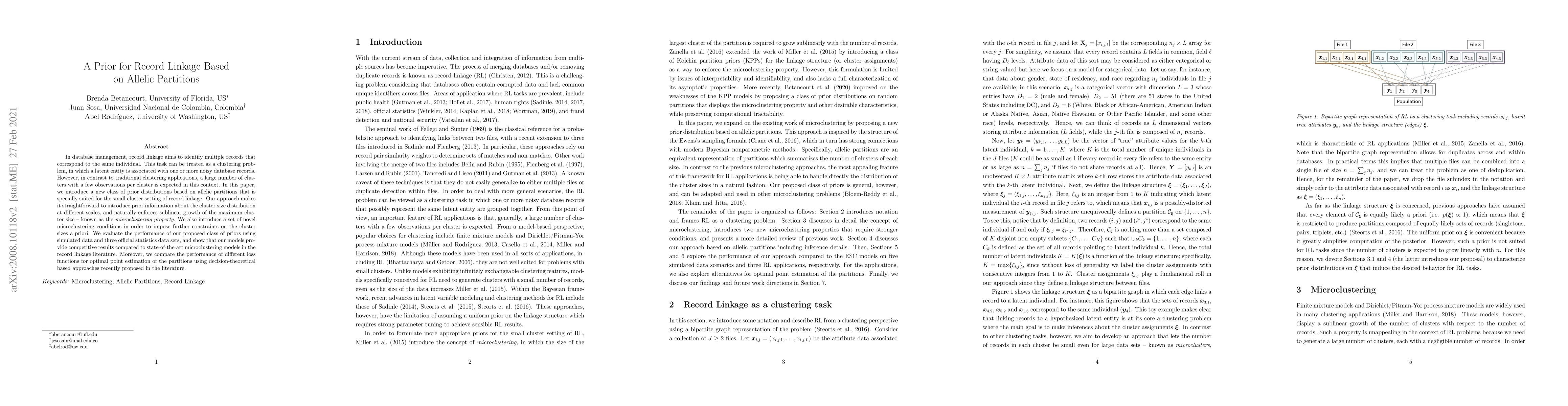 This paper introduces a novel class of prior distributions based on allelic partitions for record linkage, which is particularly suited for small clusters with few observations. The proposed method effectively incorporates prior information on cluster size distribution and enforces microclustering properties, outperforming state-of-the-art models in evaluations using both simulated and official statistics data sets.