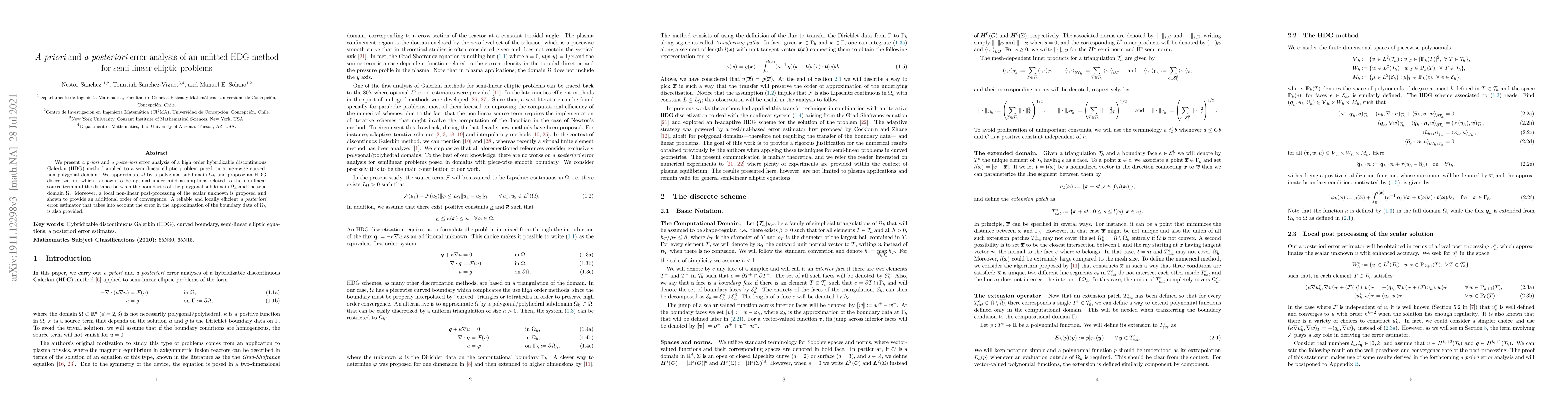 This paper conducts an a priori and a posteriori error analysis of a high-order hybridizable discontinuous Galerkin (HDG) method for semi-linear elliptic problems on curved, non-polygonal domains. The method achieves optimal convergence under mild assumptions and includes a local non-linear post-processing step for enhanced accuracy.