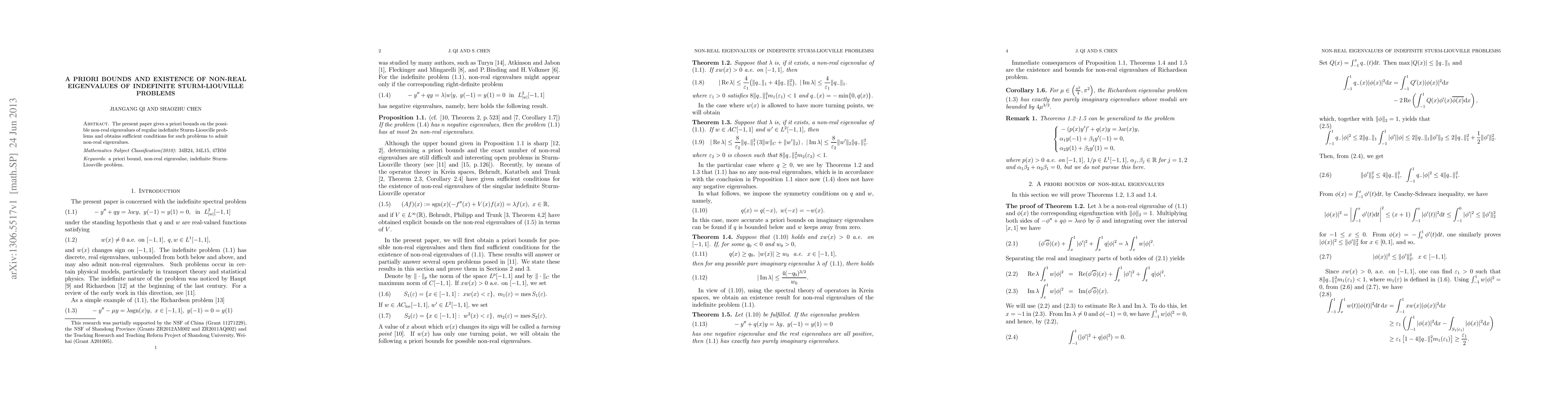 Summary: This paper establishes a priori bounds for non-real eigenvalues in indefinite Sturm-Liouville problems and provides sufficient conditions for the existence of such non-real eigenvalues.