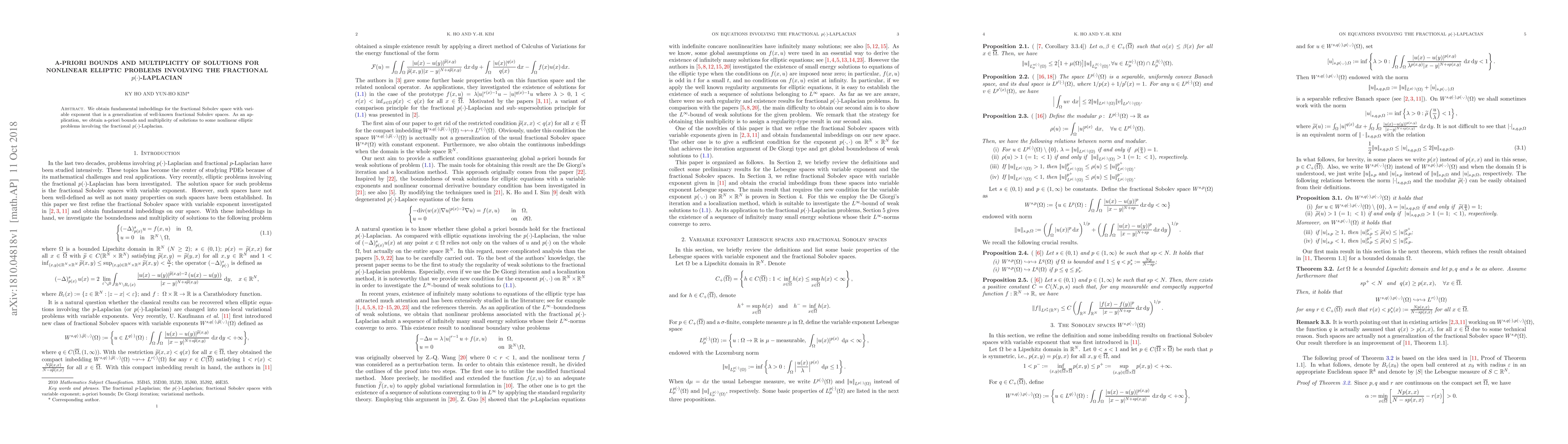 This paper establishes fundamental embeddings for a generalized fractional Sobolev space with variable exponent and applies these results to derive a-priori bounds and demonstrate the multiplicity of solutions for nonlinear elliptic problems involving the fractional $p(\cdot)$-Laplacian.