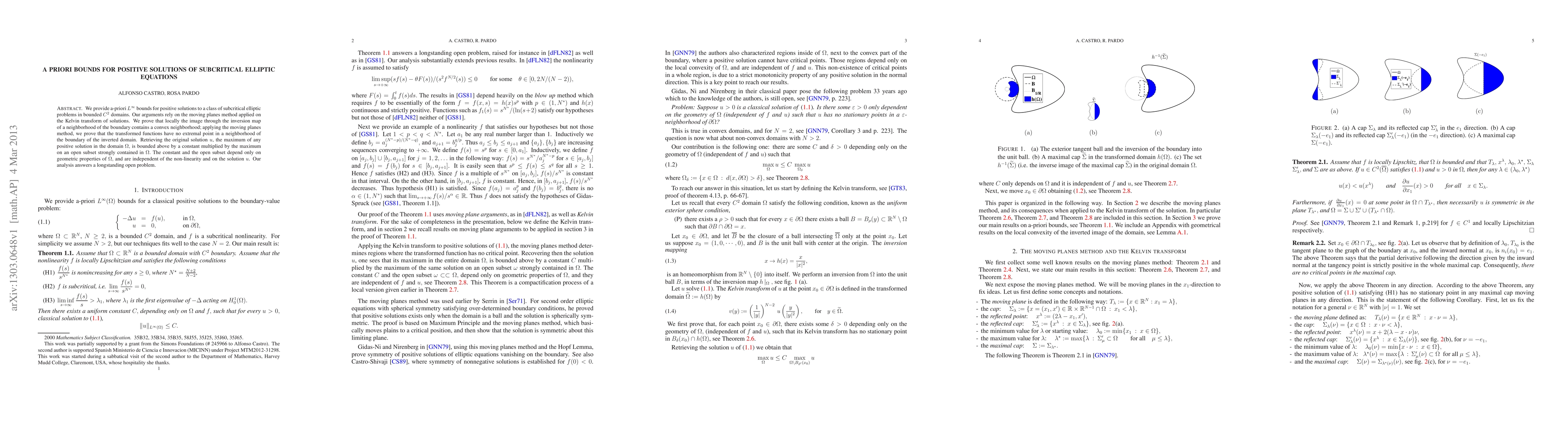 We provide a-priori $L^\infty$ bounds for positive solutions to a class of subcritical elliptic problems in bounded $C^2$ domains. Our arguments rely on the moving planes method applied on the Kelvin transform of solutions. We prove that locally the image through the inversion map of a neighborhood of the boundary contains a convex neighborhood; applying the moving planes method, we prove that the transformed functions have no extremal point in a neighborhood of the boundary of the inverted domain. Retrieving the original solution $u$, the maximum of any positive solution in the domain $\Om,$ is bounded above by a constant multiplied by the maximum on an open subset strongly contained in $\Om.$ The constant and the open subset depend only on geometric properties of $\Om,$ and are independent of the non-linearity and on the solution $u$. Our analysis answers a longstanding open problem.