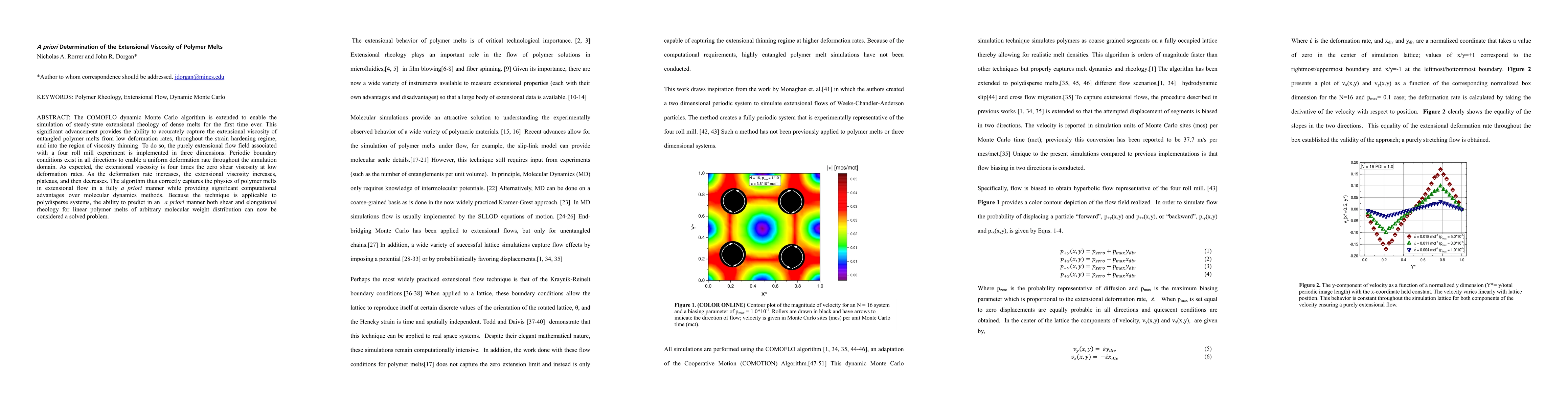 This paper introduces a novel COMOFLO dynamic Monte Carlo algorithm to simulate the extensional rheology of dense polymer melts, capturing their behavior from low to high deformation rates. The method provides accurate predictions of extensional viscosity, demonstrating computational advantages over traditional molecular dynamics.