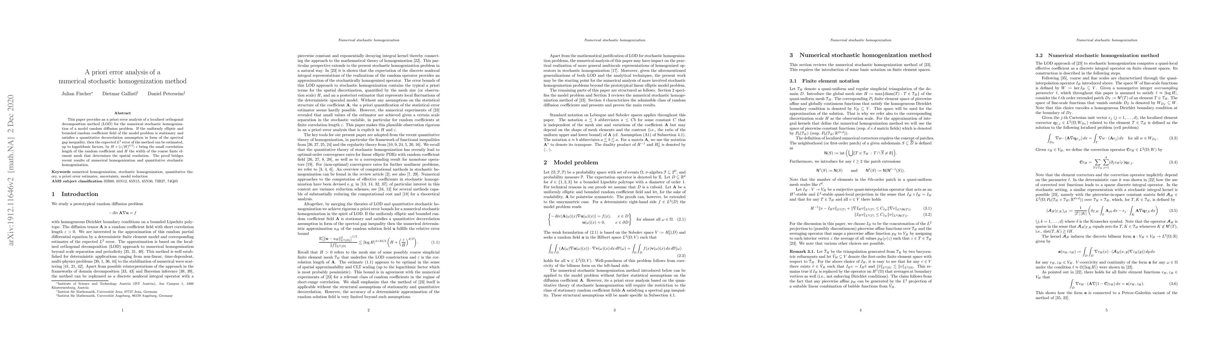 Researchers developed an error analysis method for a numerical stochastic homogenization technique, showing that its accuracy can be estimated using the correlation length of a random coefficient field and the mesh resolution.